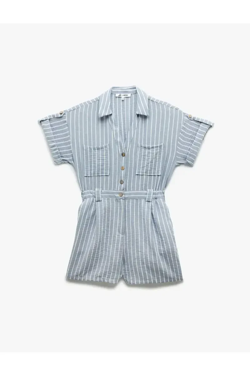 Tugmachali qisqa yengli cho'ntak detalli ko'ylak yoqali mini salopet kombinezon