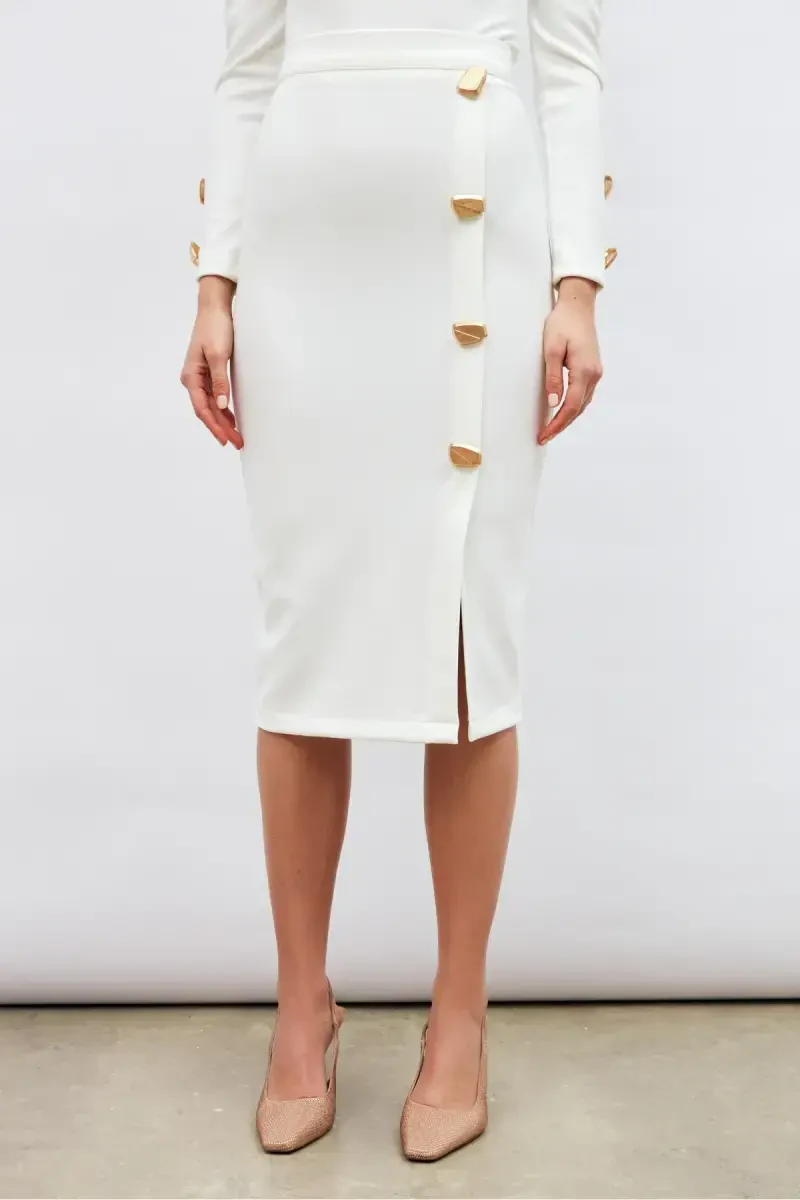 Nafislik va o‘ziga xoslikni uyg‘unlashtirgan tugma detalli qalam yubka, har bir ayolning shkafida bo‘lishi kerak bo‘lgan asosiy narsalardan biridir. Ekru rangi har qanday kombinatsiyaga mos keladi, sizga ham kundalik, ham maxsus kunlar uchun o‘ziga xos uslub yaratishga yordam beradi.