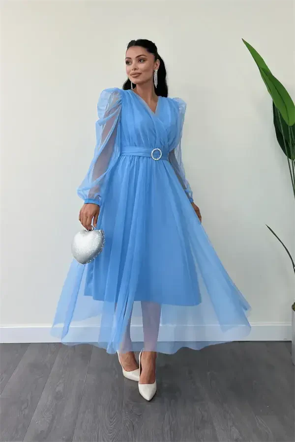 Небесно-голубое тюлевое платье | Элегантное вечернее платье с запахом и каменным поясом