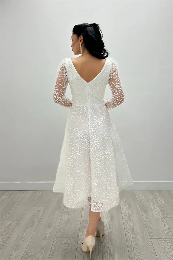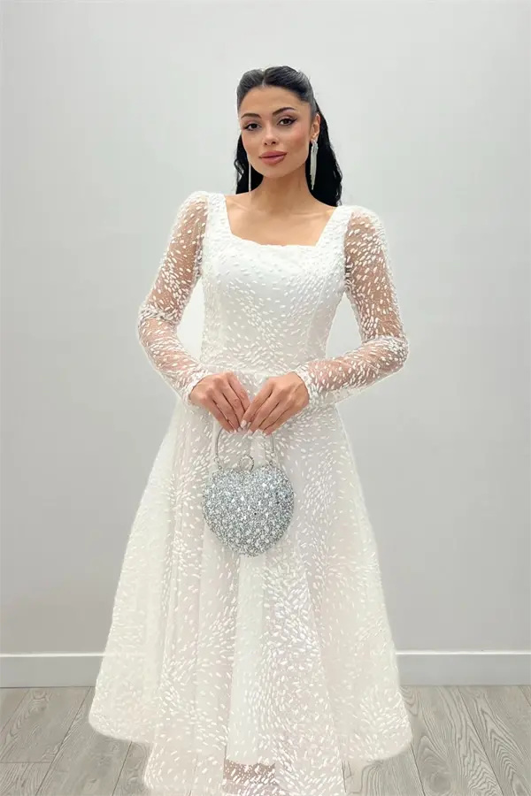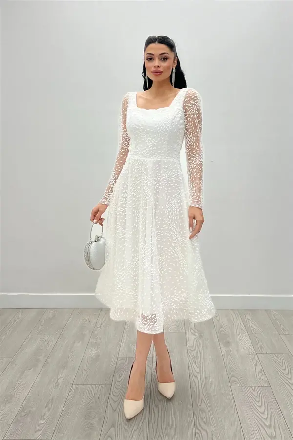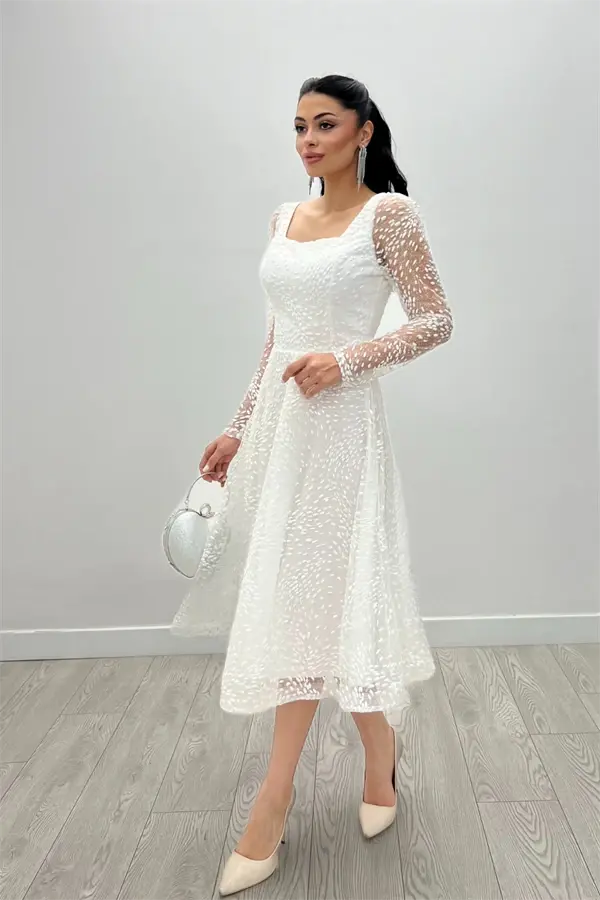Tül Simli Kumaş Kare Yaka Midi Abiye Elbise - BEYAZ