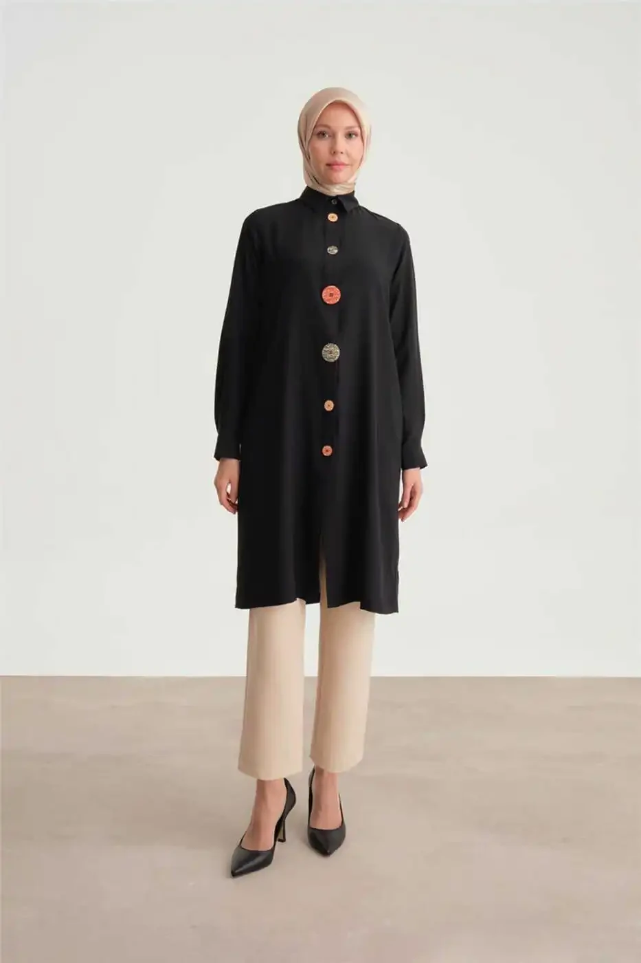 This Tunik Ort4208 in black comes in a simple yet chic design that's perfect for everyday wear. The mandarin collar detail provides a modern and elegant look, while the long sleeves offer comfort during colder temperatures. Its high-quality viscose material boasts a soft texture and is gentle on your skin. The waist-accentuating belt detail creates a feminine silhouette and can be adjusted to your personal preference. Its woven fabric type is durable and breathable, ensuring longevity. Designed specifically for the modest fashion collection, this tunic stands out with its modern lines while adhering to modest dressing standards. With its regular fit and size options, it accommodates all body types and appeals to all age groups.