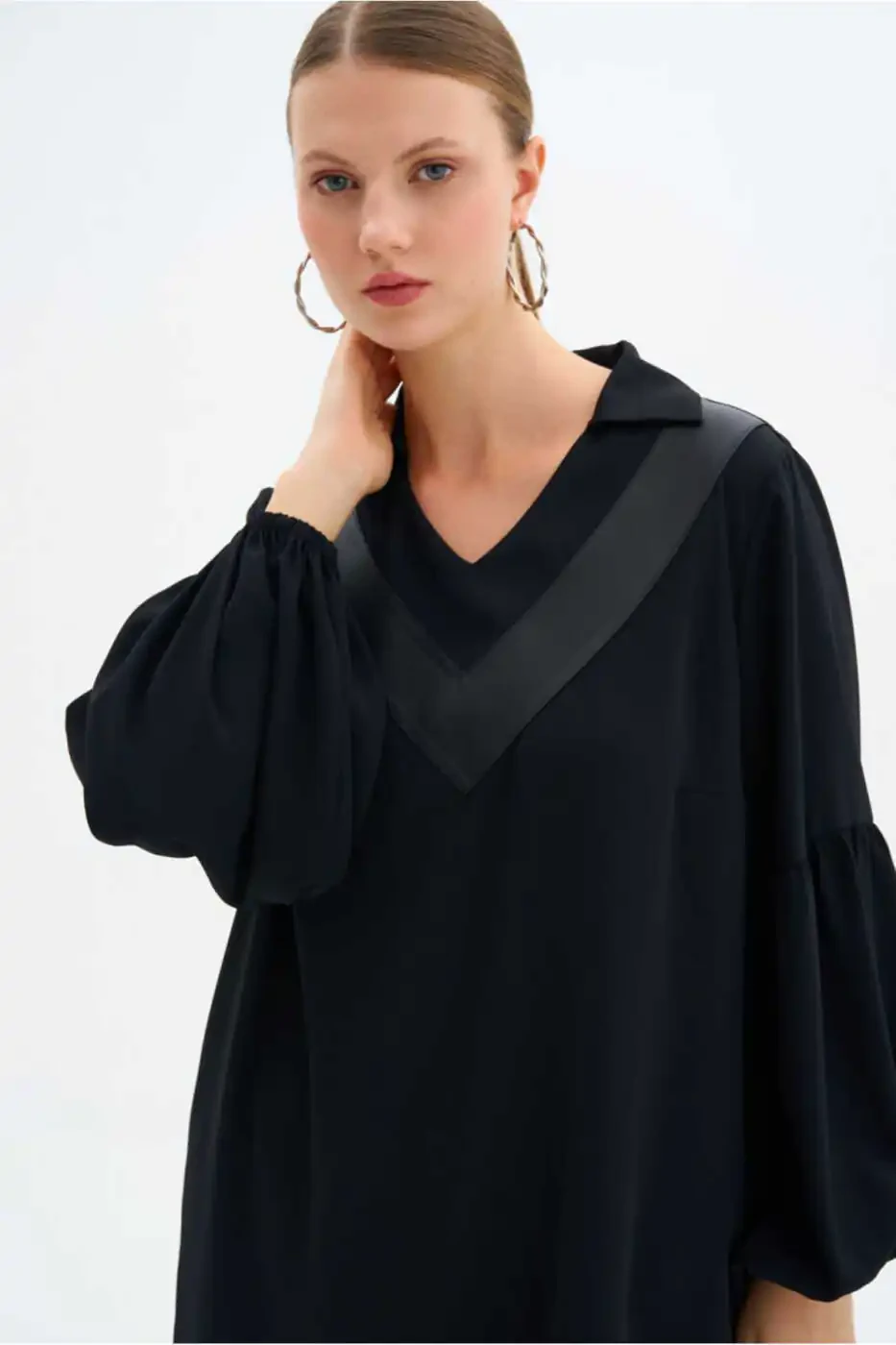 V-образный туника, туника с отделкой, женская туника, элегантная туника, удобная туника, туника с длинными рукавами, полиэстеровая туника, сезонная туника, туника особого дизайна, туника свободного кроя