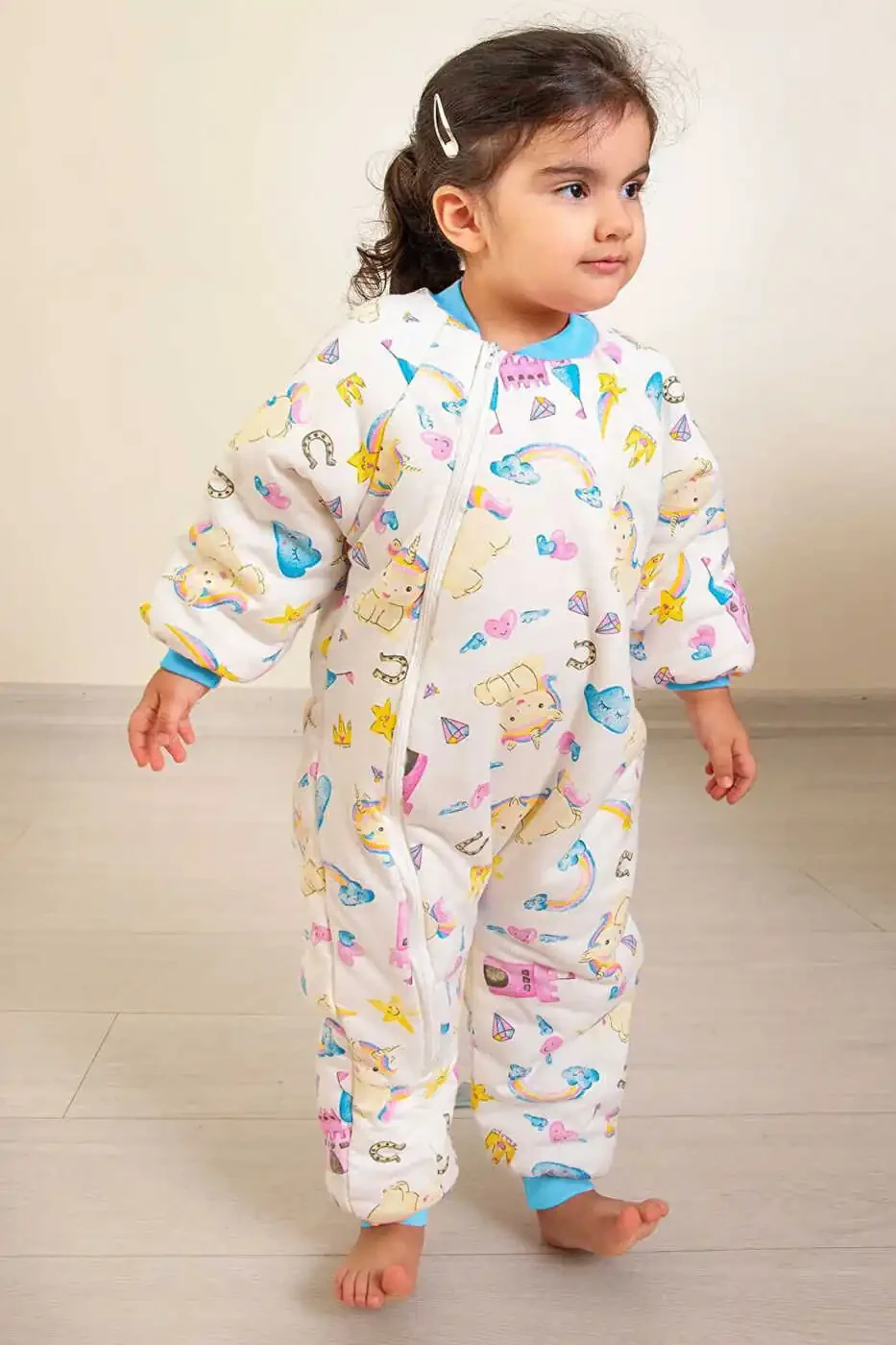 Kichik malikaning tushlarini rang-barang qiladigan yoqimli unicorn naqshli uyqu kostyumi bilan tanishing! Turkuaz rufflelari va yumshoq to'qimasi bilan, farzandingizning tungi uxlashini qulay va xotirjam o'tkazishiga imkon beradi. Paxtadan tayyorlangan bu uyqu kostyumi, nozik teri uchun ham idealdir. Farzandingizning qulayligi va xavfsizligi uchun maxsus mo'ljallangan. Uyqu kostyumining fermuari, farzandingizning oson kiyib chiqishi uchun old tomonda joylashgan.