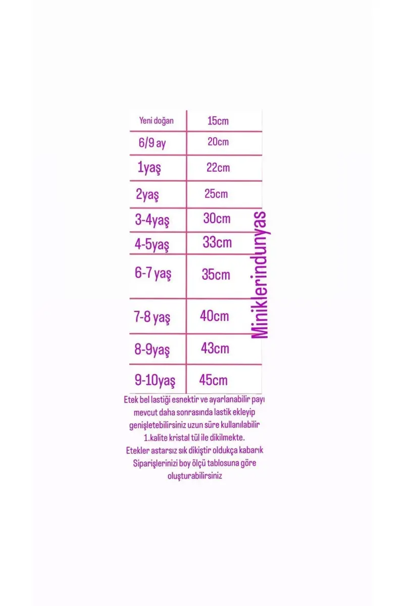 Bu ürün miniklerindunyas tarafından gönderilecektir.Kampanya fiyatından satılmak üzere 5 adetten fazla stok sunulmuştur.Bir ürün, birden fazla satıcı tarafından satılabilir. Birden fazla satıcı tarafından satışa sunulan ürünlerin satıcıları ürün için belirledikleri fiyata, satıcı puanlarına, teslimat statülerine, ürünlerdeki promosyonlara, kargonun bedava olup olmamasına ve ürünlerin hızlı teslimat ile teslim edilip edilememesine, ürünlerin stok ve kategorileri bilgilerine göre sıralanmaktadır.Bu üründen en fazla 10 adet sipariş verilebilir. 10 adedin üzerindeki siparişleri Trendyol iptal etme hakkını saklı tutar. Belirlenen bu limit kurumsal siparişlerde geçerli olmayıp, kurumsal siparişler için farklı limitler belirlenebilmektedir.15 gün içinde ücretsiz iade. Detaylı bilgi için [page="return_conditions"]tıklayın .- Tekstil materyalden üretilmiş, dayanıklı ve konforlu bir kullanım sunar- Dokuma kumaş yapısı ile şık ve zarif bir görünüm sağlar- Tül dokuma tipi, eteğe hafif ve akıcı bir hava katarken, hareket özgürlüğü sunar- Düz kesimi sayesinde sade ve zamansız bir stil yaratır- Parti ortamları için idealdirşıklığınızı tamamlayacak zarif bir seçimdir- Her yaş grubuna hitap eden tasarımıyla geniş bir kullanıcı yelpazesine sahiptir- Lastikli bel detayı sayesinde rahat bir oturuş sağlar ve gün boyu konforlu bir deneyim sunar- Düz deseniyle sadelikten yana olanların tercihi olup, kombin yapmayı kolaylaştırır.- Mini boyu ile modern ve genç bir görünüm kazandırırken, bebek ve çocuklar için de uygundur