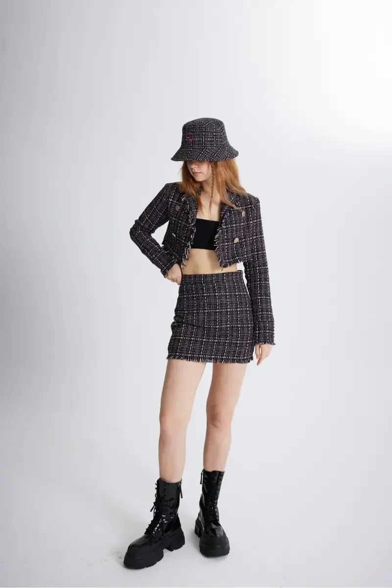 Твидовая текстура ткани. Укороченный крой. Элегантный дизайн. Черный цвет.