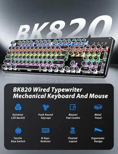 This Typewriter Mechanical Gaming Keyboard and Mouse set is designed for both professional gamers and daily users. Its durability is increased thanks to its metal panel, and it has a retro look with its round keycaps. Blue switches provide a satisfying click sound and tactile feedback with every keystroke. Rainbow LED lighting gives your keyboard and mouse a vibrant and dynamic look, while the anti-ghosting feature ensures that all commands are detected correctly even when multiple keys are pressed simultaneously. Thanks to its ergonomic design, it minimizes wrist and hand fatigue even during long-term use. Moreover, the mouse pad that comes with the product further improves your gaming experience by allowing your mouse to move more smoothly. The mouse with a high-sensitivity optical sensor gives you an advantage in games with its fast response time, while its ergonomic design maintains your comfort even during long-term use. Thanks to the plug-and-play feature, you can easily start using it without the need for any driver installation. This set is not just a keyboard and mouse, but also a lifestyle statement. Make a difference with this set that will accompany you both while gaming and doing your daily work.