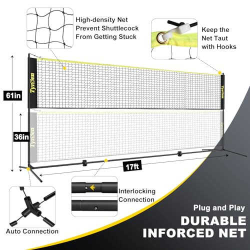 𝐒𝐓𝐀𝐑𝐓 𝐖𝐈𝐓𝐇 𝐂𝐎𝐌𝐏𝐋𝐄𝐓𝐄 𝐂𝐎𝐌𝐁𝐎 𝐒𝐄𝐓 - 1 x adjustable Net(17ft wide), 4 x badminton rackets, 3 x shuttlecocks, 4 x pickleball paddles, 4 x pickleballs, 4 x metal stakes, 1 x marker lines 1 x drawstring 600D Oxford storage bag and 1 x use manual. The entire pickleball and badmintonn set of 4 can fit perfectly into the carrying bag for portability. 𝐕𝐄𝐑𝐒𝐀𝐓𝐈𝐋𝐄 𝐂𝐎𝐌𝐁𝐎 𝐍𝐄𝐓 - Adjustable height ranging from 36 to 61 inches, catering to both Pickleball, Badminton, kid’s volleyball and soccer. Perfect for 2-4 players. This complete badminton set is ideal for various settings such as indoor courts, garage, outdoor driveways, yards, and parks. 𝐍𝐎 𝐌𝐎𝐑𝐄 𝐃𝐑𝐎𝐎𝐏𝐘 𝐍𝐄𝐓 - The net is equipped with hook and loop fastener to allow easy adjust of the net's tension, to keep the top and bottom net taut and straight.The net also features a meticulously crafted mesh grid with a size of 2.5x2.5cm, ensuring no shuttlecocks will get trapped in the net. 𝐄𝐅𝐅𝐎𝐑𝐓𝐋𝐄𝐒𝐒 𝐀𝐒𝐒𝐄𝐌𝐁𝐋𝐘 - Even the kids can pitch in! The poles easily connect with elastic cords, requiring no additional tools. Within 3-5 minutes, you'll have your net ready. And when it's time to pack up, the simple dismantling process ensures hassle-free storage and transportation. 𝐄𝐍𝐇𝐀𝐍𝐂𝐄𝐃 𝐒𝐓𝐀𝐁𝐈𝐋𝐈𝐓𝐘 𝐃𝐄𝐒𝐈𝐆𝐍 - This combo sport set has premium 1mm thicken steel poles, which improve much stabiliiy and can withstand bad weather, there are also 4 ground nails to ensure the badminton net stay stable on the grass ground during games. 𝐆𝐈𝐅𝐓 𝐓𝐇𝐄 𝐅𝐔𝐍 - This portable pickleball net set will be a perfect gift for those of all ages and skill levels. Bring the excitement of sports right now to your home, whether you're planning a backyard party, a family reunion, or a weekend gathering, this complete badminton and pickleball set will bring infinite happiness to everyone. 𝐑𝐈𝐒𝐊-𝐅𝐑𝐄𝐄 𝐒𝐇𝐎𝐏𝐏𝐈𝐍𝐆 - We stand behind our products and offer 1-year guaranty, our service team is available all day. Accessory is also in supply, if you have any issues with your pickleball net, no need to return, contact us via Contact Seller, we will resolve for you.
