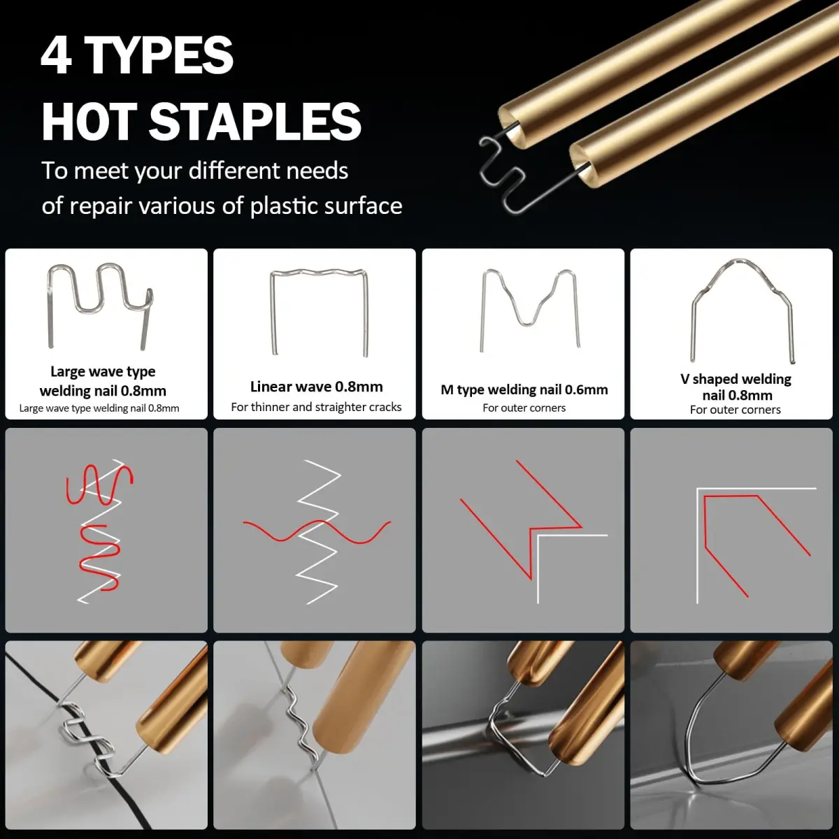 Uanit Plastic Welding Gun 110V Welder Kit is a superior welding kit that utilizes 50W hot staple technology, offering a wide range of repair possibilities, from car bumpers to instrument panels, lamp holders to other broken plastic parts. This kit is specifically designed for car owners and hobbyist repairers, allowing you to easily and effectively repair broken plastic parts. By doing your own repairs, you can save both time and money.This welding kit is extremely easy to use. Select the appropriate staple for your needs, place it in the brass holder, press the power button, and wait a few seconds. Allow the staple to slowly melt into the plastic part. Be careful not to let the staple pass completely through the plastic surface. This process ensures that the plastic parts are joined together durably.The Uanit Plastic Welding Gun comes with 4 different types of staples to meet your different repair needs. V-shaped staples solve problems in inner corners, while M-shaped staples are ideal for solving problems in outer corners. The other two staple types are specifically designed for repairs on flat surfaces. This allows you to easily perform all kinds of plastic repairs.Another important feature of this welding kit is the lighting lamp on the front. This lamp allows you to work comfortably even in dimly lit environments. This feature is especially useful in tight and dark areas inside the vehicle or when there is not enough lighting in your workshop.At Uanit, customer satisfaction is our top priority. If you are not satisfied with our product or receive a damaged product, please do not hesitate to contact us. We will be happy to assist you and find a solution to your problem. We will be happy to offer you the most suitable solution with product exchange or refund options. Get professional results with the Uanit Plastic Welding Gun for broken bumpers, cracked panels and more. Choose Uanit for long-lasting and reliable repairs.