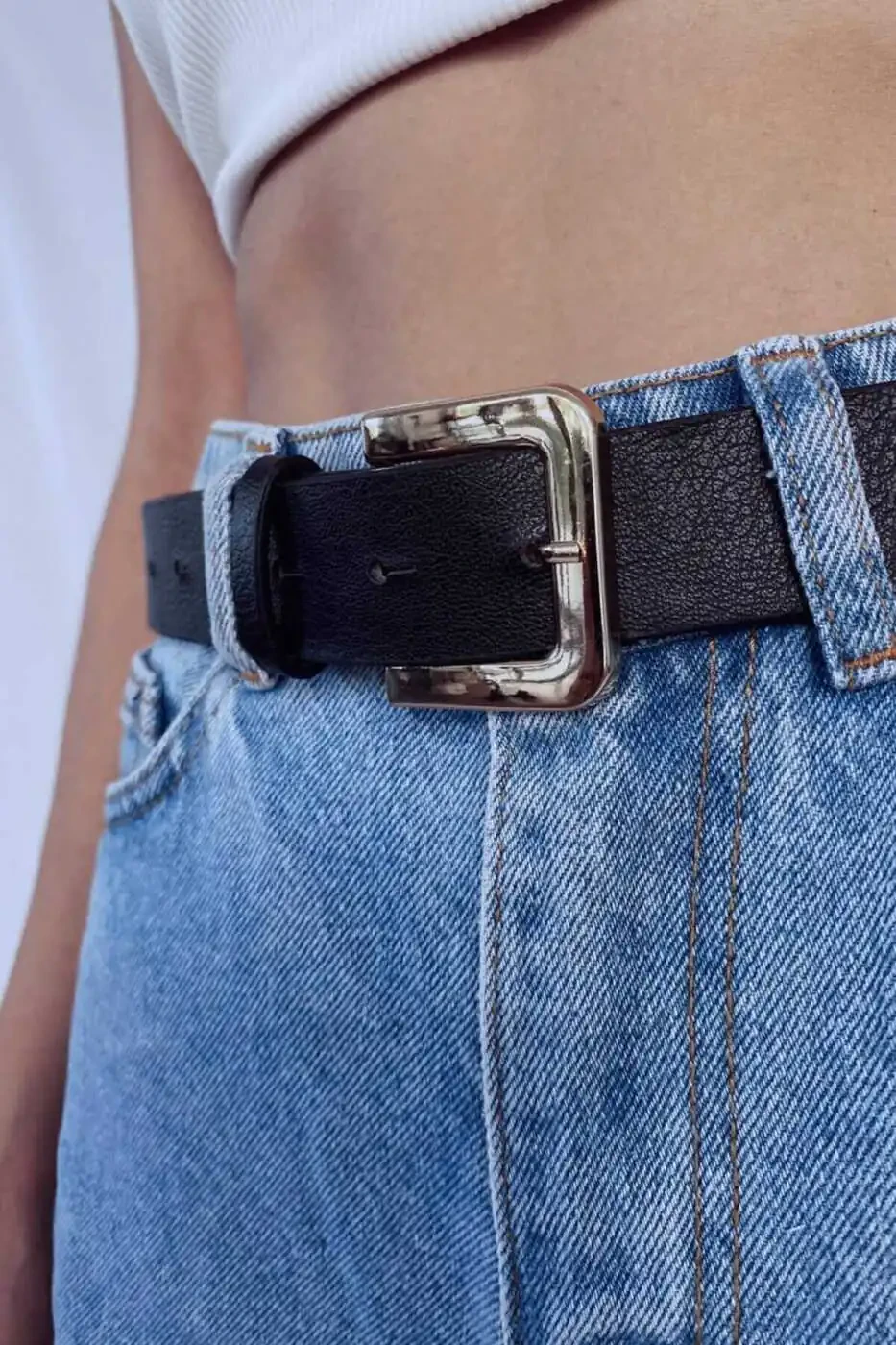 - Для более повседневного стиля вы можете выбрать сочетание джинсов, белой футболки и углового классического ремня.