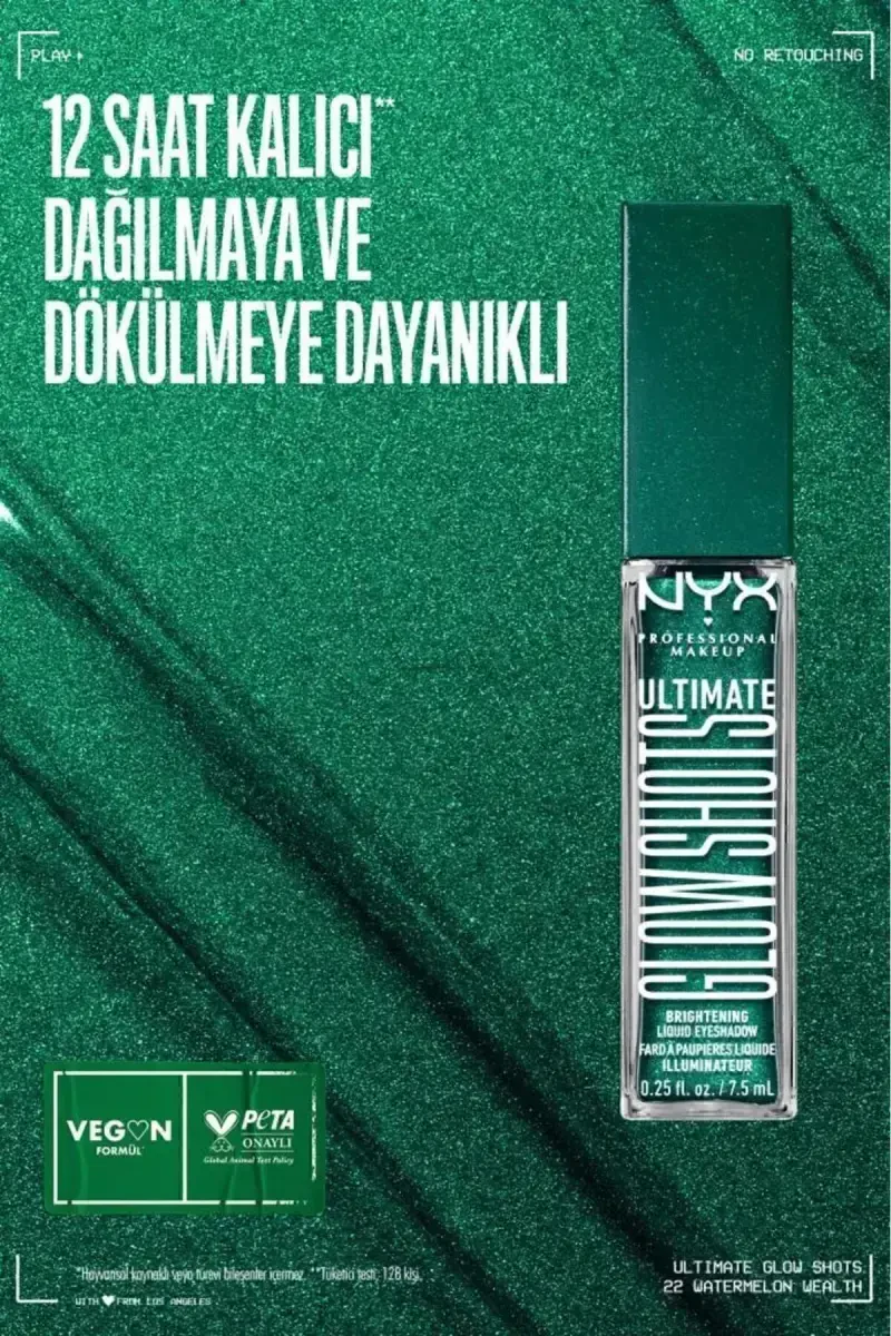 NYX Professional Makeup'tan Ultimate Glow Shots Işıltılı Likit Göz Farı ile gözlerinize anında mükemmel parlaklık ve ışıltı katın! 22 Watermelon Wealth rengiyle, karpuzun canlı ve ferah tonlarını gözlerinize taşıyın. Bu likit göz farı, yüksek pigmentasyonu sayesinde tek sürüşte bile etkileyici bir renk yoğunluğu sunar. Simli bir görüntüden uzak, sofistike ve göz alıcı bir parlaklık elde etmenizi sağlar. Ultimate Glow Shots, sadece ışıltı vermekle kalmaz, aynı zamanda içeriğindeki özel bileşenlerle göz çevrenize bakım yapar. Kafein, C vitamini ve Papaya özü içeren vegan formülü, cildinizi besler ve canlandırır. Göz kapaklarınızda ağırlık yapmayan hafif yapısıyla gün boyu konforlu bir kullanım sunar. Dağılmaya ve dökülmeye karşı dayanıklı özel formülü sayesinde makyajınızın kusursuz görünümünü 12 saate kadar korur. İster tek başına, ister diğer göz farlarıyla birlikte kullanarak farklı makyaj görünümleri yaratabilirsiniz. Ultimate Glow Shots serisinin farklı renklerini karıştırarak kendi benzersiz tarzınızı ortaya çıkarın. Gözlerinizi ön plana çıkarmak ve bakışlarınıza derinlik katmak için ideal bir seçimdir. Uygulaması son derece kolaydır; aplikatörü sayesinde istediğiniz miktarda ürünü göz kapaklarınıza uygulayabilir ve parmaklarınızla veya bir fırça yardımıyla dağıtabilirsiniz. Daha yoğun bir renk elde etmek için kat kat uygulayabilirsiniz. Ultimate Glow Shots, hem günlük makyajınızda hem de özel günlerde kullanabileceğiniz çok yönlü bir üründür. Gözlerinize ışıltı ve renk katarken, aynı zamanda cildinizi besleyen bu likit göz farı ile makyaj rutininize yeni bir boyut kazandırın. NYX Professional Makeup kalitesiyle üretilen bu ürün, hayvanlar üzerinde test edilmemiştir ve hayvansal kaynaklı hiçbir bileşen içermez.