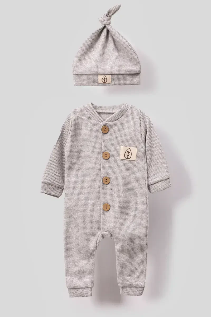 Унисекс Деревянная Пуговица с Рисунком Шапка Вафельный Стильный Детский Комбинезон-серый-Серый