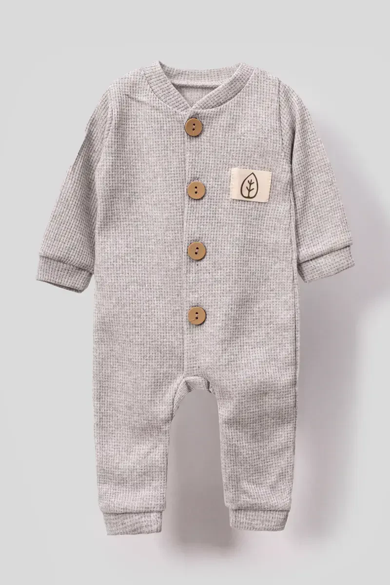 Детский комбинезон, комбинезон унисекс, комбинезон с шапкой, вафельный комбинезон, хлопковый комбинезон, комбинезон с деревянными пуговицами, серый комбинезон, комбинезон с длинными рукавами, удобный комбинезон, стильный комбинезон
