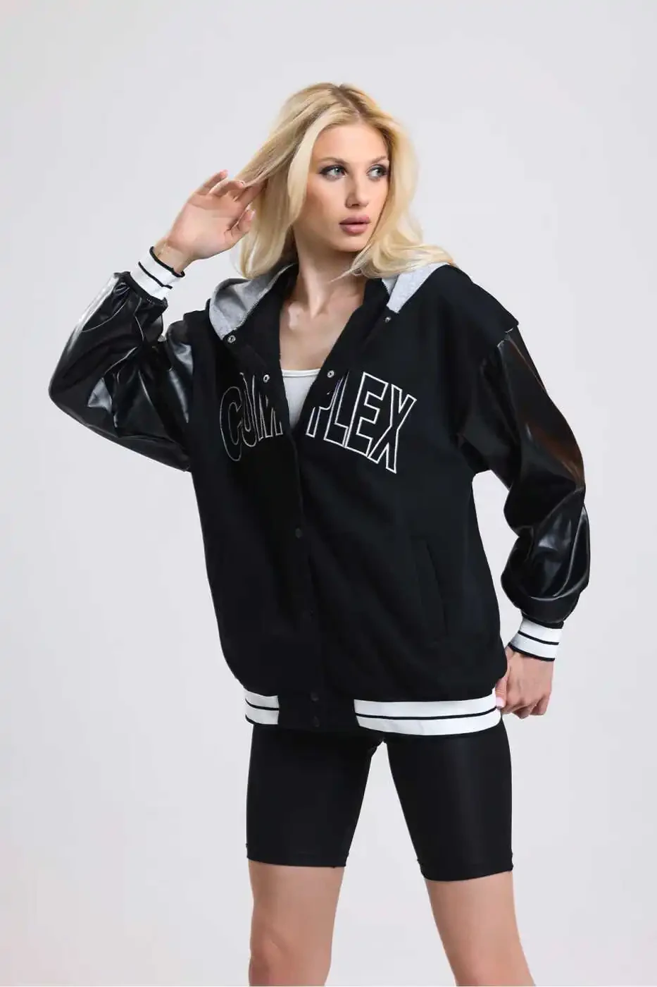 Чувствуйте себя свободно и стильно в Oversize Колледжской Куртке с Кожаными Рукавами Complex!