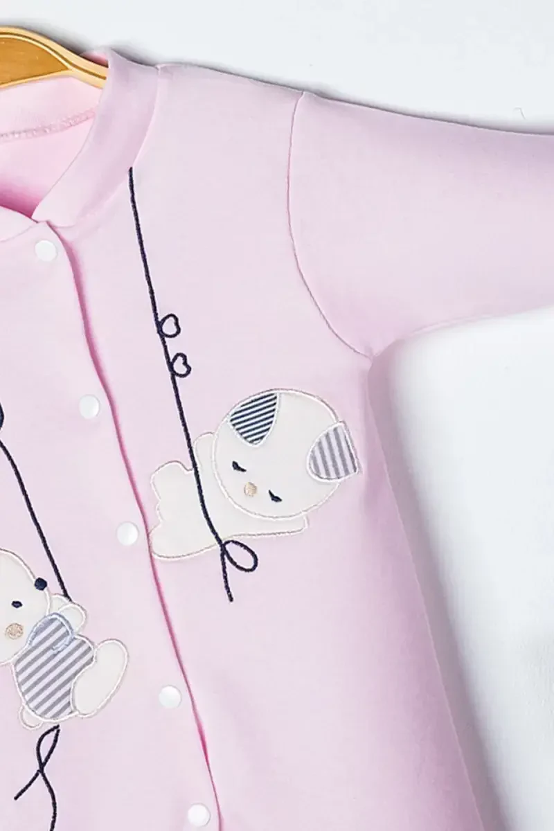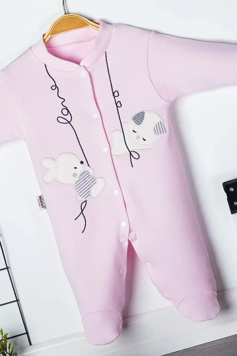 Made from 100% Organic Cotton., Does not harm your baby's sensitive skin, it has a natural and soft texture., It has antiallergic properties and does not cause irritation., There is a cute rabbit embroidery on it., Thanks to its footed design, it keeps your baby's feet warm., 3-6-9 month sizes are available., There are snap fasteners on the front of the romper, making it easy to put on and take off., It has a flexible structure that allows babies to move comfortably., Thanks to its air permeability, it prevents sweating and allows your baby's skin to breathe., Thanks to its high-quality fabric, it is long-lasting and resistant to repeated washing., It has a cute appearance with its pink color., It can be preferred for babies' daily use and special occasions., It can be washed in the washing machine, the colors do not fade., No harmful chemicals were used in its production, it does not harm your baby's health., Made in Turkey.