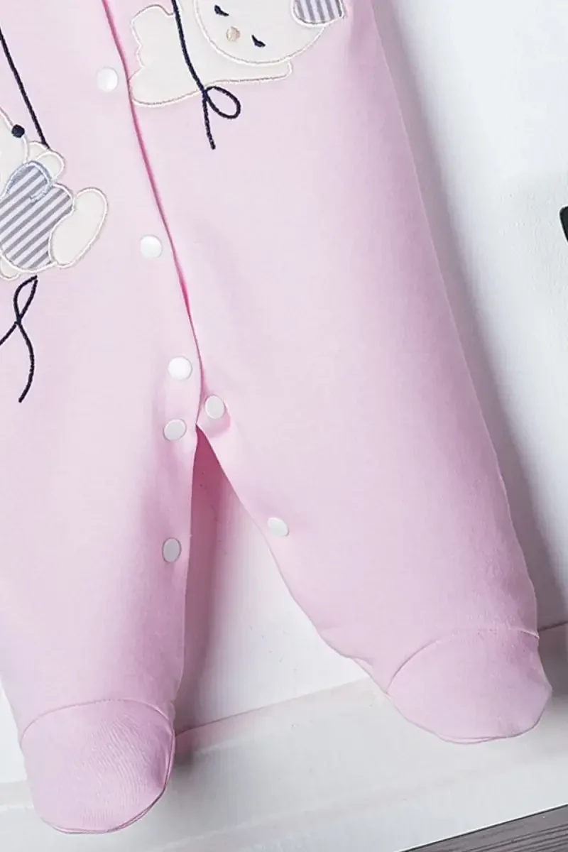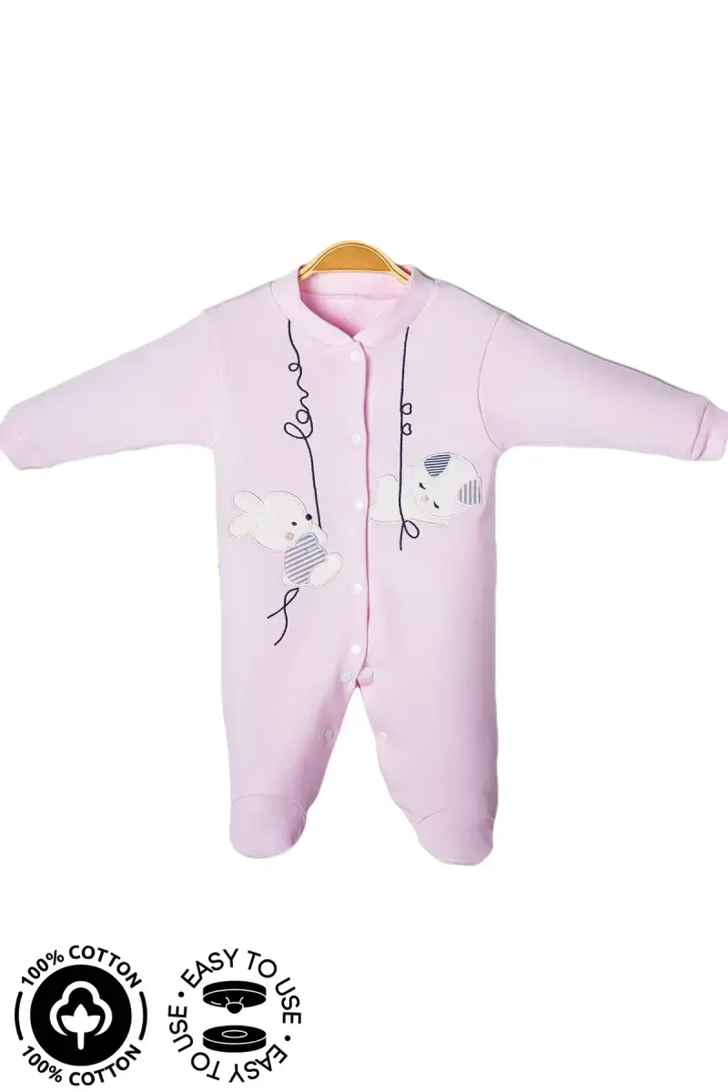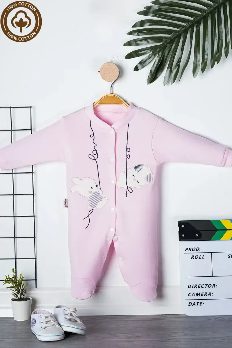 organik paxta, chaqaloq kombinezoni, allergiyaga qarshi, quyon kashtasi, oyoqli kombinezon, 3-6-9 oy, tugmachali kombinezon, elastik chaqaloq kiyimi, terlatmaydigan mato, pushti kombinezon