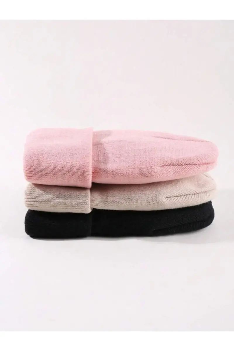 Unisex Katlamalı Siyah,taş,pembe 3'lü Bere Seti-Siyah