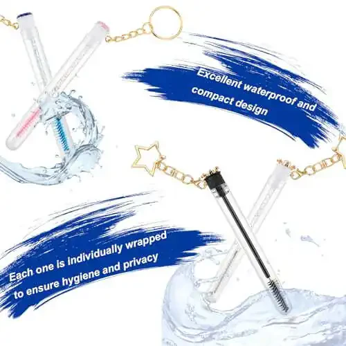 This 48 piece disposable mascara wand set has everything you need to create perfect lashes. The set includes 24 pieces crystal lash spoolie brushes and 24 pieces reusable keychain empty eyelash brush tubes.