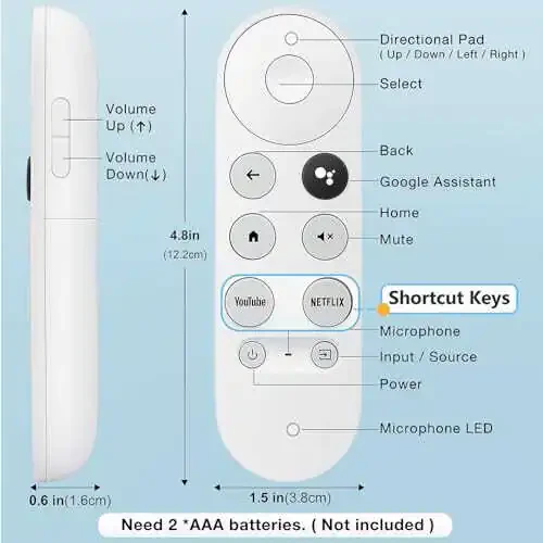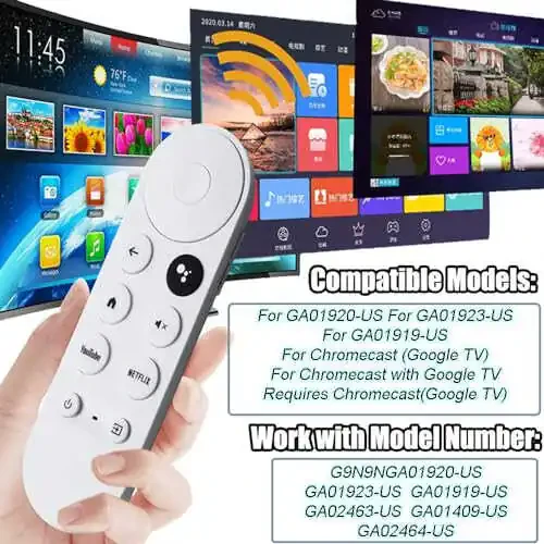 Upgrade Voice New Remote Control for Google TV Chromecast 4K Snow/HDTV, Voice Replacement Remote Control for Google TV G9N9N, GA01409-US, GA01919/20/23-US, GA02463-US, Streaming Media Player…Product DescriptionUpgrade your TV experience with the Upgrade Voice New Remote Control designed for Google TV Chromecast 4K Snow/HDTV and other compatible devices. This advanced voice remote integrates into the heart of your smart home entertainment system, offering you unparalleled control and convenience. Compatible with model numbers such as G9N9N, GA01409-US, GA01919/20/23-US, GA02463-US, this remote is an excellent alternative to replace your lost or damaged original remote. No more spending hours navigating complex menus or switching between channels. With the intuitive design and user-friendly interface of the Upgrade Voice New Remote Control, you can quickly and easily access your favorite content. Launch your movies, series, music and more with just a few clicks.One of the most notable features of this remote is its advanced voice search capabilities. Thanks to Google Assistant integration, you can find the content you want by simply speaking, open apps, check the weather, and even control your smart home devices. With commands like "Play comedy movies on Netflix" or "Turn off the lights," you can effortlessly manage your home entertainment system.With its ergonomic design and lightweight construction, the Upgrade Voice New Remote Control provides comfort even during prolonged use. The placement of the keys offers a natural and comfortable grip, making it ideal for all types of users. Additionally, it is made of durable materials and is resistant to daily use and offers a long-lasting use.The Upgrade Voice New Remote Control is more than just a remote; it is a tool that helps you unlock the full potential of your home entertainment system. It pairs seamlessly with Google TV Chromecast 4K Snow/HDTV and compatible devices, providing you with an uninterrupted entertainment experience. Now watching television will not only be an activity, but a pleasant and interactive experience.A perfect replacement for your Streaming Media Player, this voice remote is designed to simplify home entertainment and make it more enjoyable. You can easily start using it without the need for complex installation processes or technical knowledge. Simply insert the batteries and pair your remote with your device, and the rest will take care of itself.Redefine the entertainment experience in your home with the Upgrade Voice New Remote Control. With its advanced features, user-friendly design and unique control capabilities, this remote will be an indispensable part of your home entertainment system.Product Features* Compatible with Google TV Chromecast 4K Snow/HDTV* Advanced voice search feature (Google Assistant integration)* Compatible Model Numbers: G9N9N, GA01409-US, GA01919/20/23-US, GA02463-US* Replacement remote for Streaming Media Player* Ergonomic design and lightweight construction* User-friendly interface* Made of durable materials* Easy installation and pairing* Fast and easy content accessAdditional InformationThis product is designed to replace your lost or damaged original Google TV remote. Batteries are not included. Please make sure to pair your remote with your device before using it. Refer to your device's user manual for pairing instructions.