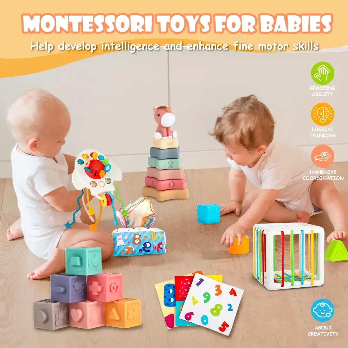 Игрушки UQN Montessori - это набор из 6 игрушек «6 в 1», специально разработанный для детей от 6 до 12 месяцев. Он предлагает тщательно подобранные занятия, которые помогут развить сенсорные, моторные и когнитивные навыки вашего ребенка. Этот универсальный игровой набор состоит из множества игрушек, таких как разноцветные кольца для складывания в стопку, волшебная коробочка для салфеток, мягкая игрушка на веревочке и коробочка для сортировки фигурок, для веселого и познавательного времяпрепровождения. Он помогает развить воображение, творческие способности и навыки решения проблем вашего ребенка, а также способствует развитию координации рук и глаз, мелкой моторики и способности распознавать цвета и формы. Игрушки UQN Montessori изготовлены с учетом безопасности вашего ребенка. Они изготовлены из материалов, не содержащих BPA, нетоксичных и не содержащих химикатов, и прошли испытания на безопасность, чтобы соответствовать самым высоким стандартам качества и безопасности. Мягкие и прочные материалы позволяют вашему ребенку безопасно играть и исследовать. Их легко чистить, поэтому вы можете обеспечить гигиеничную игровую среду. Этот игровой набор «6 в 1» адаптируется к различным этапам развития вашего ребенка и обеспечивает долгосрочную ценность игры. Кольца для складывания в стопку помогают вашему ребенку развить координацию рук и глаз и мелкую моторику, в то время как коробка для сортировки по форме способствует развитию навыков решения проблем и распознавания форм. Игрушка на веревочке помогает им понять причинно-следственную связь, а волшебная коробочка для салфеток обеспечивает веселый и интерактивный игровой процесс. А милая игрушка-единорог питает воображение и творческие способности вашего ребенка. Игрушки UQN Montessori - идеальный подарок на день рождения или Новый год для вашего ребенка. Этот игровой набор, одновременно веселый и познавательный, способствует развитию вашего ребенка и обеспечивает часы развлечений. Поставляется с практичной сумкой для хранения, чтобы игрушки были организованы и их можно было легко переносить. Не пропустите этот замечательный набор игрушек, который будет сопровождать вашего ребенка в его счастливом взрослении!