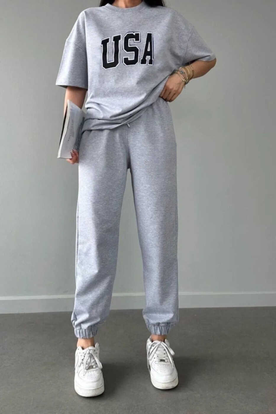 Usa T-shirt, Eşofman Altı, Jogger, Takım, Gri, Oversize, Bisiklet Yaka, Rahat, Stil, Günlük Giyim