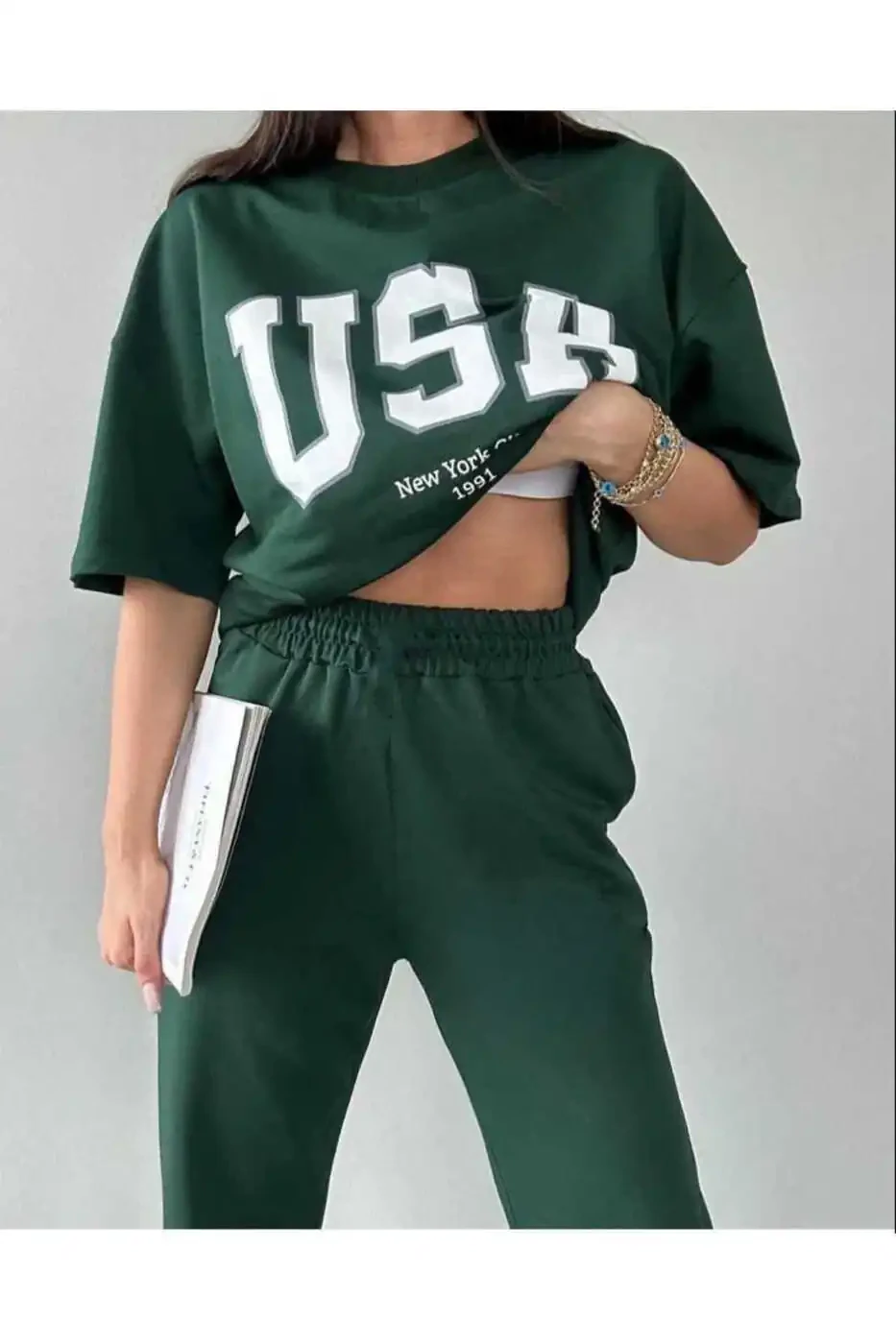 Usa T-shirt Sweatpants Jogger - Green Printed Top and Bottom Tracksuit Oversize Crew Neck