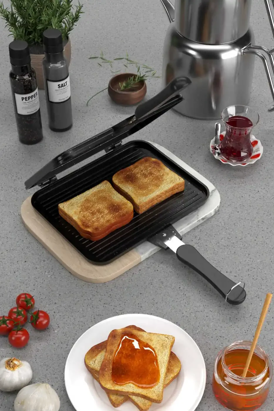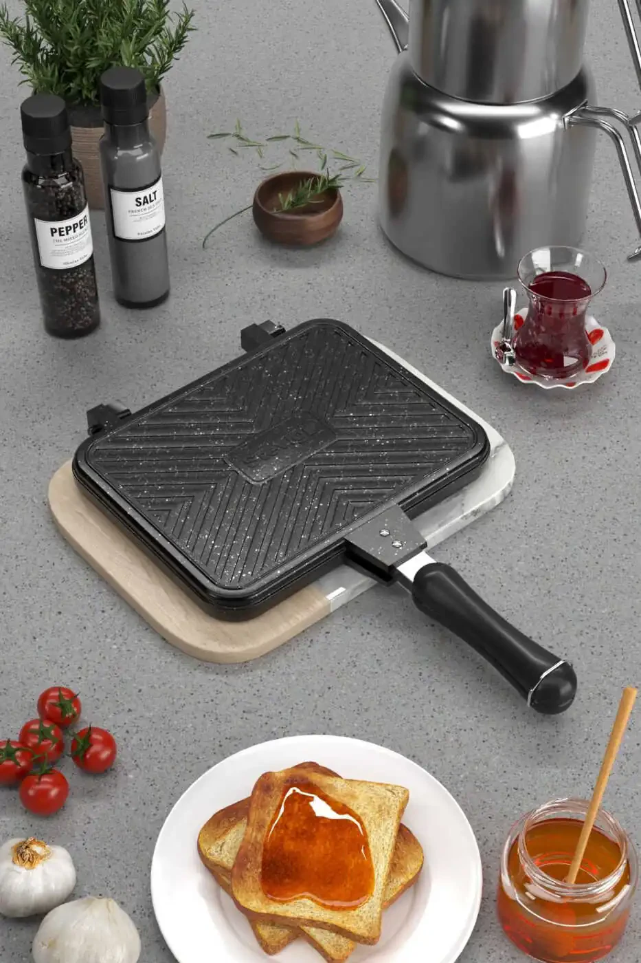 Bulaşık makinesinde yıkanması tavsiye edilmez. İlk kullanımdan önce hafifçe yağlanması önerilir. Ürünün uzun ömürlü olması için metal mutfak gereçleri kullanmaktan kaçının. Isıyı kontrol ederek tostların yanmasını engelleyebilirsiniz.