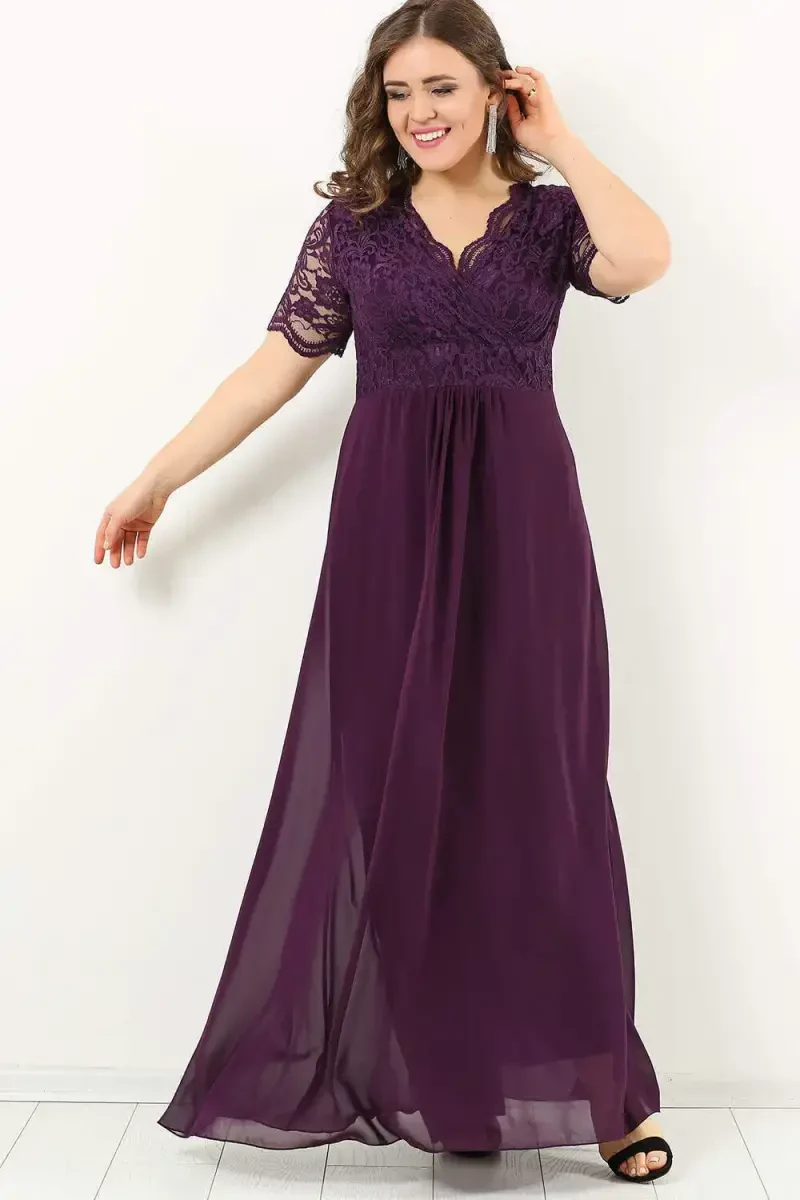 **Üstü Güpür Şifon Büyük Beden Abiye Elbise MOR DD793**