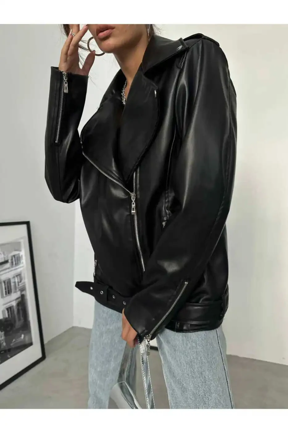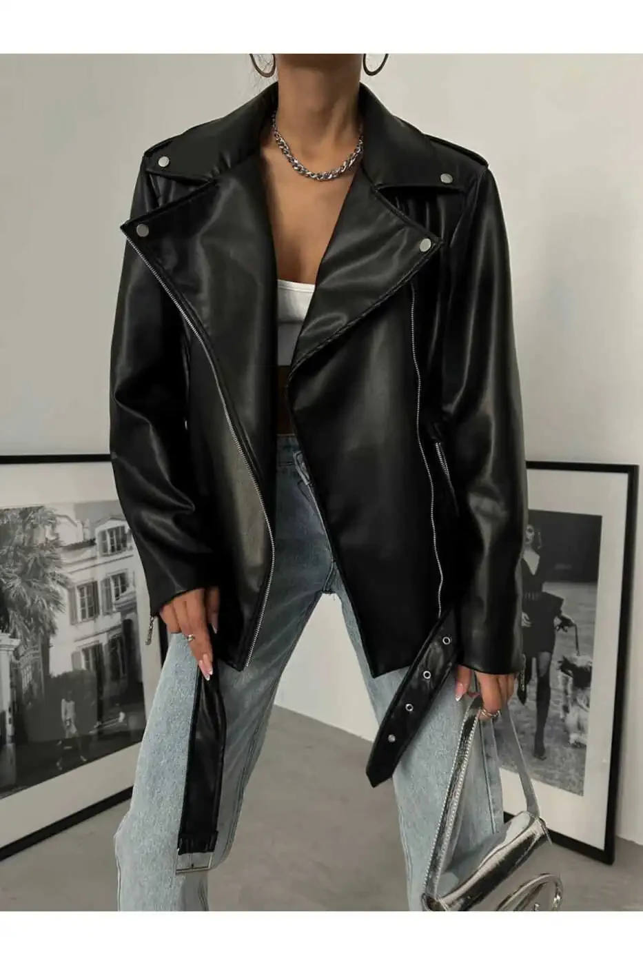 Boyfriend leather jackets have been one of the most sought-after pieces in the fashion world in recent years with their comfortable and cool style. This jacket enriches the classic boyfriend style with a stylish belt detail, giving it a modern touch. Its long cut creates a chic look and protects you from the cold. Zippered pockets allow you to carry everything you need in everyday use.