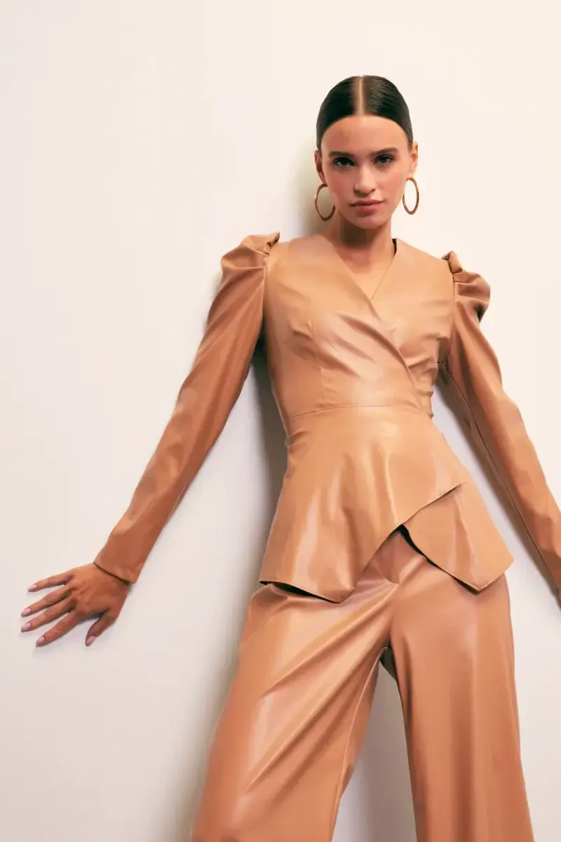 Agar uslubingizga nafislik qo'shadigan kiyim qidirsangiz, Yoqa Ko'rinishidagi Teri Bluzka siz uchun ajoyib tanlovdir!