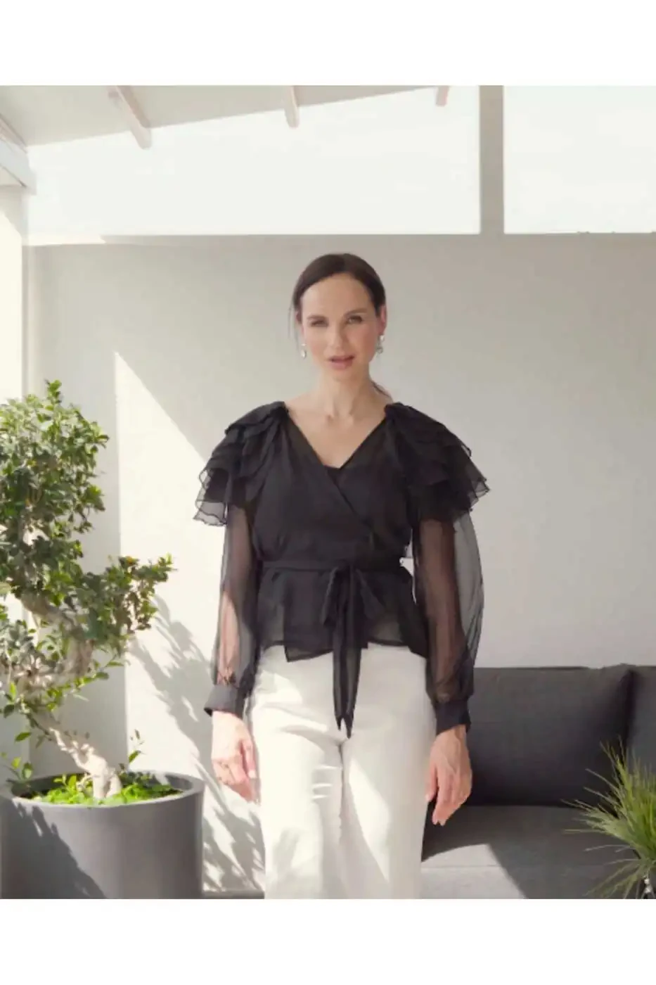 ## Qora Rangi V Yaxali Kat-qat Yelkali Ko'ylak (39339)