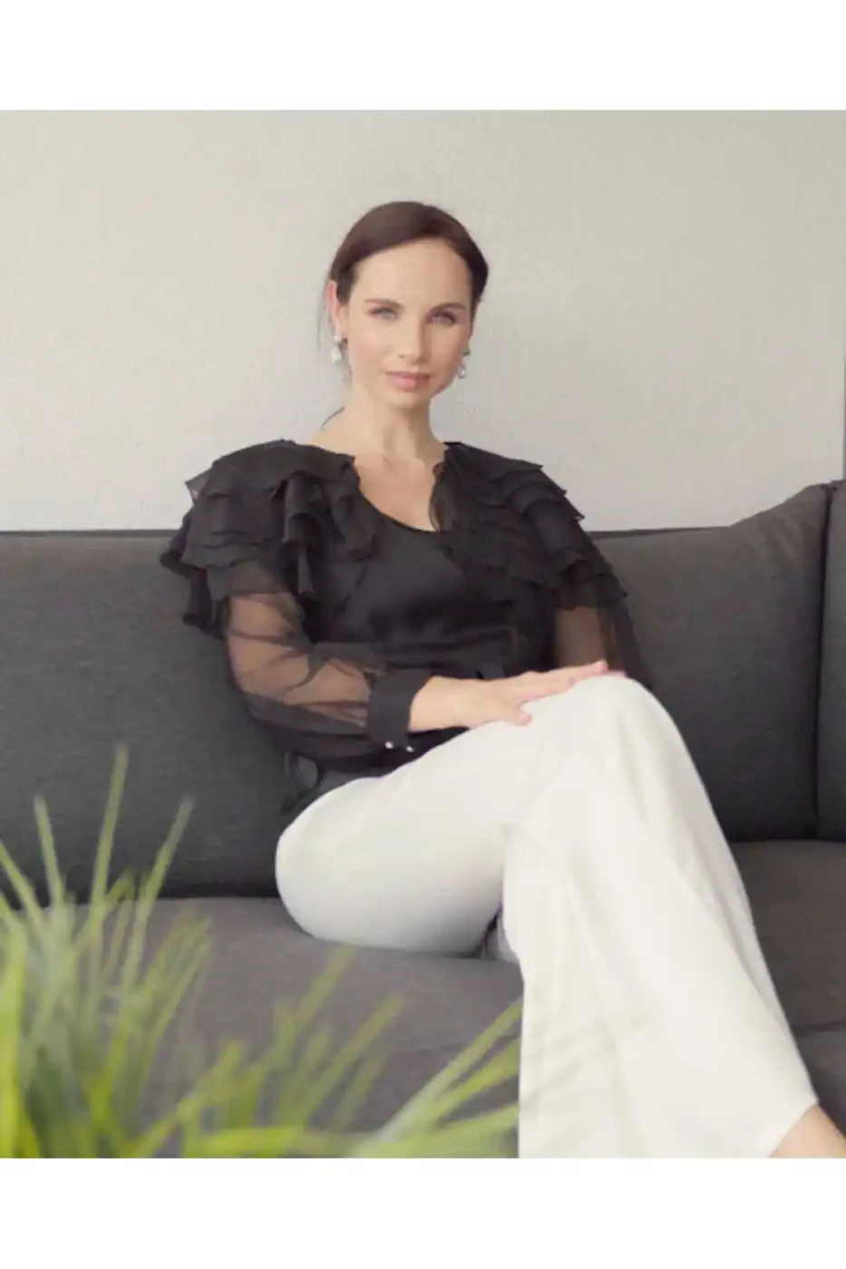 V shaklidagi yoqa detali va yelkalaridagi kat-qat dizayn ko'ylakka zamonaviy ko'rinish baxsh etadi, ayni paytda jozibaliqni ta'minlaydi. Yuqori sifatli materialdan ishlab chiqarilgan bu ko'ylak qulay va qulay kiyim tajribasini taqdim etadi, qora rangi bilan klassik jozibadorlikni ta'minlaydi.