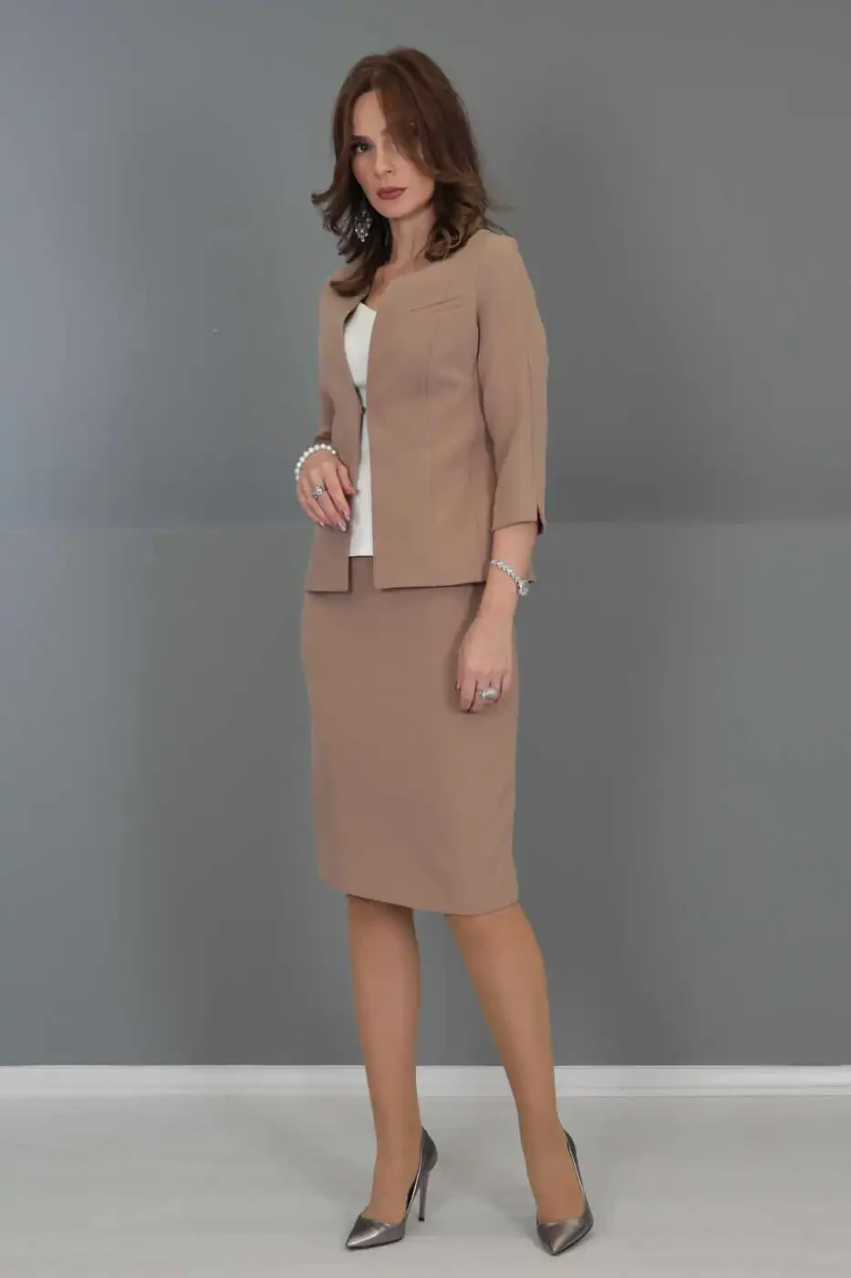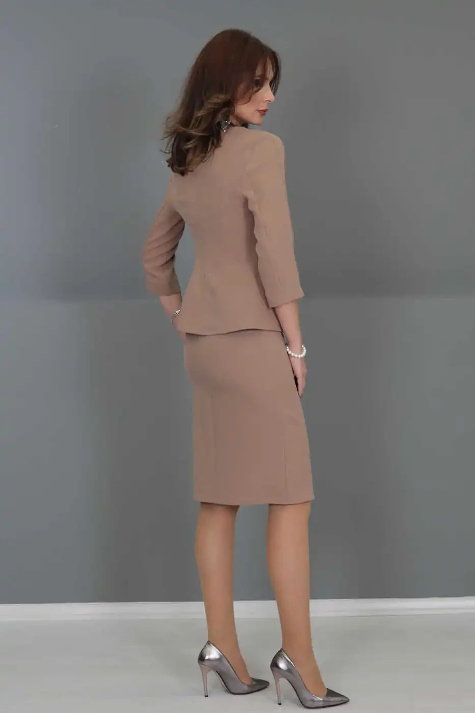 V bo'yinli qisqa ko'ylagi & Qalam yubka to'plam, har bir ayolning garderobida bo'lishi kerak bo'lgan, uslub va nafislikning uyg'unligi. Ochqish jigarrang rangi bilan zamonaviy nafislikni taqdim etadigan to'plam, turli kombinatsiyalar bilan kun bo'yi uslubli bo'lishingizga imkon beradi.