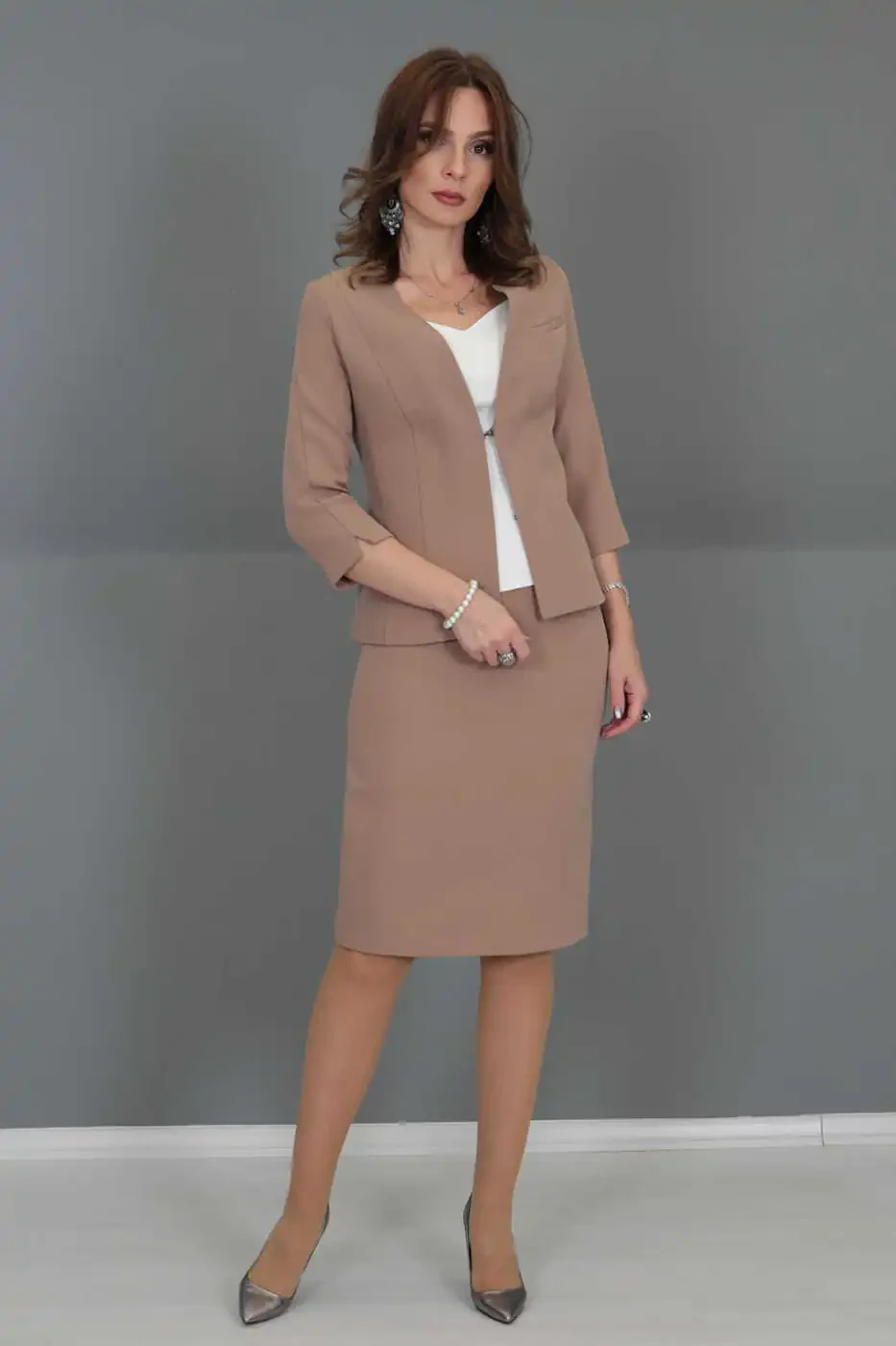 v bo'yinli ko'ylagi, qalam yubka, to'plam, ayollar kiyimi, ochqish jigarrang, uslubli, nafis, ofis, kundalik, kombinatsiya