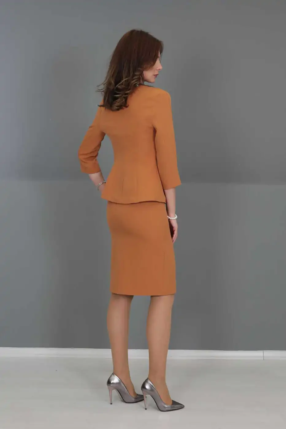 V neck jacket, pencil skirt, suit, taupe color, elegance, style, women's clothing