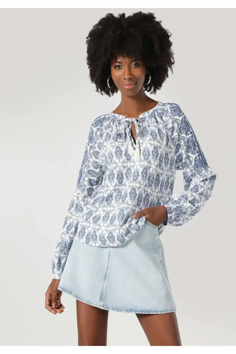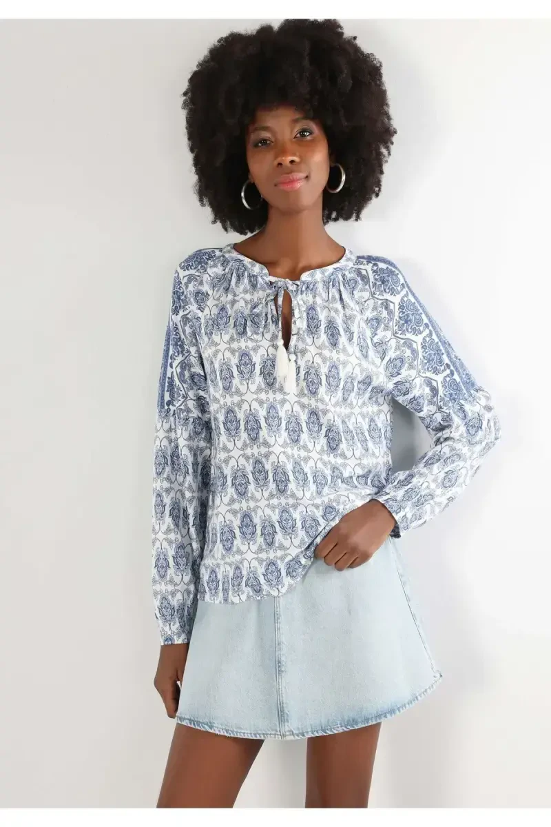 Combining style and comfort, the Regular Fit V-Neck Printed Blue Women's Long Sleeve Blouse is ready to become an indispensable part of your wardrobe. Featuring a V-neck and long sleeves, the blouse offers a modern look, while its comfortable cut provides all-day comfort. The blue color and stylish print will complement any outfit, making it a choice you can easily wear for special occasions and everyday life. Made from cotton, the blouse keeps you cool and comfortable even in hot weather with its breathable structure. Its soft texture leaves a pleasant feeling on your skin.