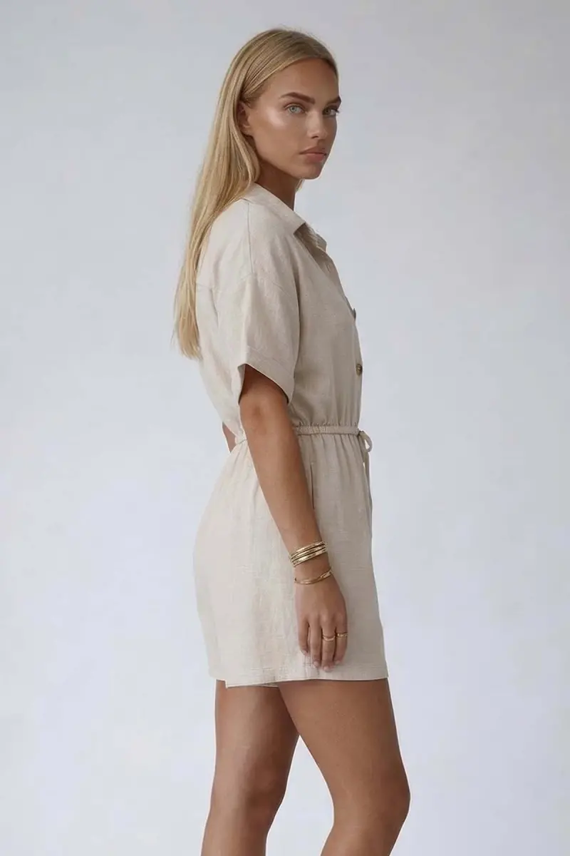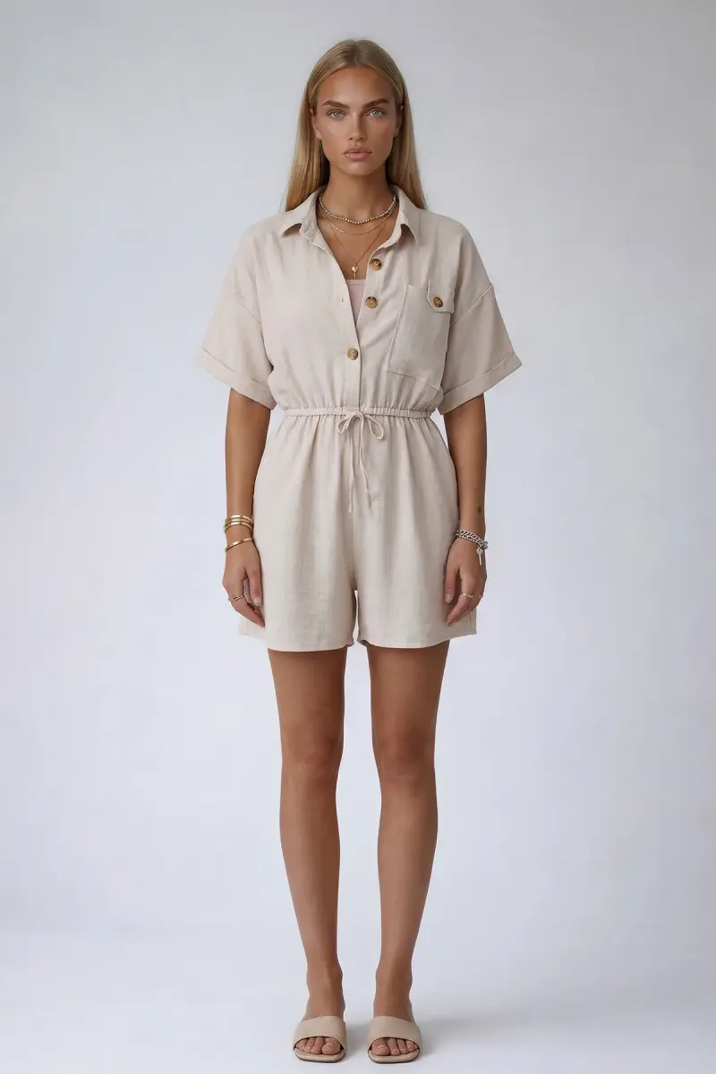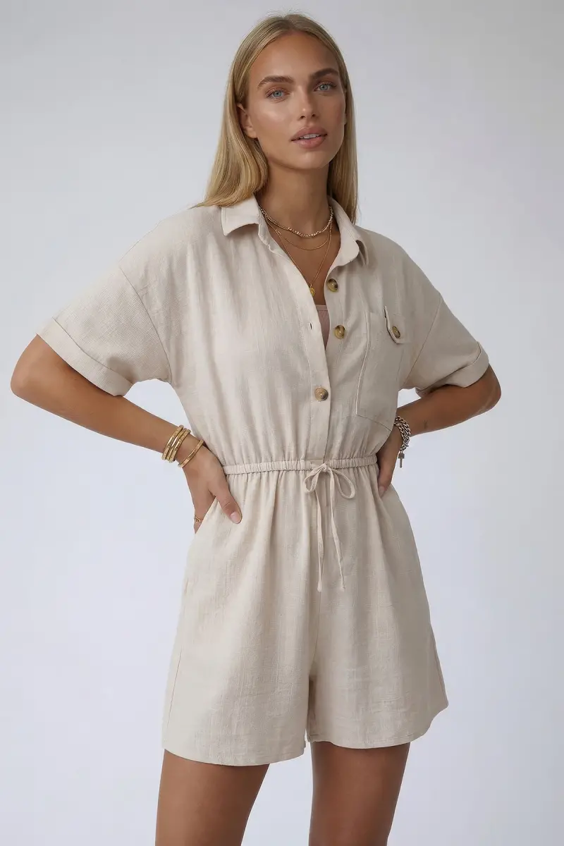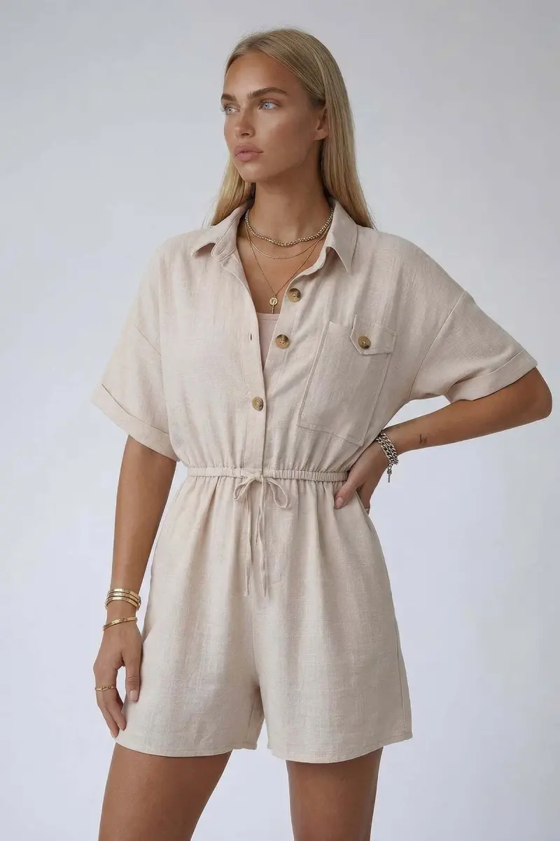 Vanilya Gömlek Yaka Çift Cepli Keten Şort Tulum-VANİLYA