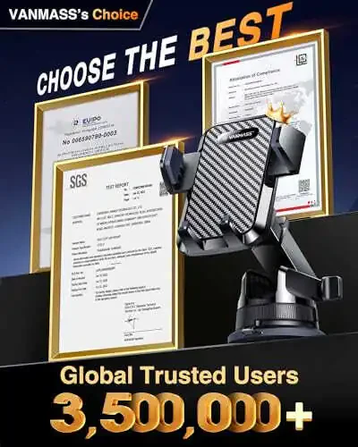 【BEST Newest Car Phone Holder】VANMASS's best car phone mount with the highest rating! Preferred by 3,500,000+ Customers; Designed by world-class professional team; enjoy EUIPO Patent (No.007708805-0001), Military-grade certificate (No. GZMR220601855501), CP65/REACH/ROHS; 4,000+ kinds of material selection, 500+ suction cup upgrade designs, and 20,000 miles of road tests; giving birth to the best combo of the Flagship&Classic hoolder with newest suction cup 【2025 Newest Rotary Mighty Suction Cup: Strongest Suction】Made of German materials, exclusive formula, one-piece molding rotary suction cup technology to ensure no melting or marks, UV and direct sun exposure resistance, -40~194℉,resistance. Maximize the adhesion of suction cups to ensure the best results: 85LB Suction - 50% higher than the traditional,especially for bumpy roads. (Note: NEW upgraded suction cup can be directly adsorbed to dash without pad! Pad is easy to damage the dashboard!) 【Humanized Details-Integrated Molding, Data Safety Pledge】1: Integrated molding bracket ensures the best support&data safety assurance, superior to those flimsy ones; 2: The ideal bottom tray wide: 0.96in-from our customers' voice, compatible all kinds of charging cables; 3: Back release button has been tested to be the quickest way, smooth 1s picking and placing 【2025 Strongest 3 -level Adjustable Clip- Best Design for 99% Vent】Fit 0.07-0.1” Thickness Vent Blade of 99% Vehicles (Horizontal/Vertical), easy to use by switching lever. Not only the Inner Thickened-Steel-Plate is Durable & Never Loose, but also Different from the pure-steel-clip in the market, the Covered Soft-Silicone-Pads Protect vent blade from Scratches 【All-Round Hold for 4"-7" Phones】To adapt to different phones and cases and give you and your family & friends a luxury experience, VANMASS invented a 3.76” wide adjustable two sides clamp arm. This phone holder is compatible with most mobile phones and thinks cases, compatible for iPhone 16 Pro Max15 14 13 12 11 XR X, Samsung Galaxy S23 S22 S21 S20 Ultra A70 A21 A12 A52 5G, Google Pixel, and Xiaomi Redmi, Motorola, OnePlus, HUAWEI, etc 【Luxury Gift: Top-notch Configuration&Master Designed Package】Exquisite cell phone holder comes with suction mount & vent clip Combo. The unit is extremely flexible! Dashboard, Windshield, Air Vent, all places work perfectly! All Well-packaged in a Reliable, Elegant & Eco-friendly box. Package includes phone mount *1, Suction Cup*1, Vent Clip*1 Length of Telescopic Arm: 5"-7.5" Height of Suction Base: 2.13" Width of Clamp Arm: 2.2"-3.8" (Universal Phone Compability) Depth of Phone Cradle: 0.7" (Thick Case Compatibility)