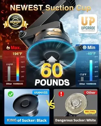 VANMASS [Haqiqiy harbiy darajali] Avtomobil telefon ushlagichi shunchaki telefon ushlagichidan ko'proq; bu sizning xavfsizligingiz va qulayligingiz uchun mo'ljallangan yo'l hamrohingizdir. Ushbu mahsulot yuqori sifatli materiallar va innovatsion dizayni tufayli ko'p yillar davomida sizga xizmat qiladi. Mahsulotning harbiy sinf chidamliligi hatto qiyin yo'l sharoitlarida ham telefoningizning xavfsiz bo'lishini ta'minlaydi. Kuchli vakuumli so'rg'ich va qisqich turli o'rnatish variantlarini taklif qilib, avtomobilingizning ichki dizayniga mos keladi. Teleskopik qo'l va aylanadigan boshliq telefoningizni eng qulay ko'rish burchagiga sozlash imkonini beradi. "Bir marta bosish bilan chiqarish" funksiyasi haydash paytida bir qo'l bilan telefoningizni osongina o'rnatish va olib tashlash imkonini beradi. VANMASS siz uchun eng yaxshi haydash tajribasini taqdim etishni maqsad qilgan. CP65 / REACH / RoHS xavfsizlik sertifikatlariga ega bo'lgan ushbu mahsulot sizning salomatligingiz uchun ham xavfsizdir.