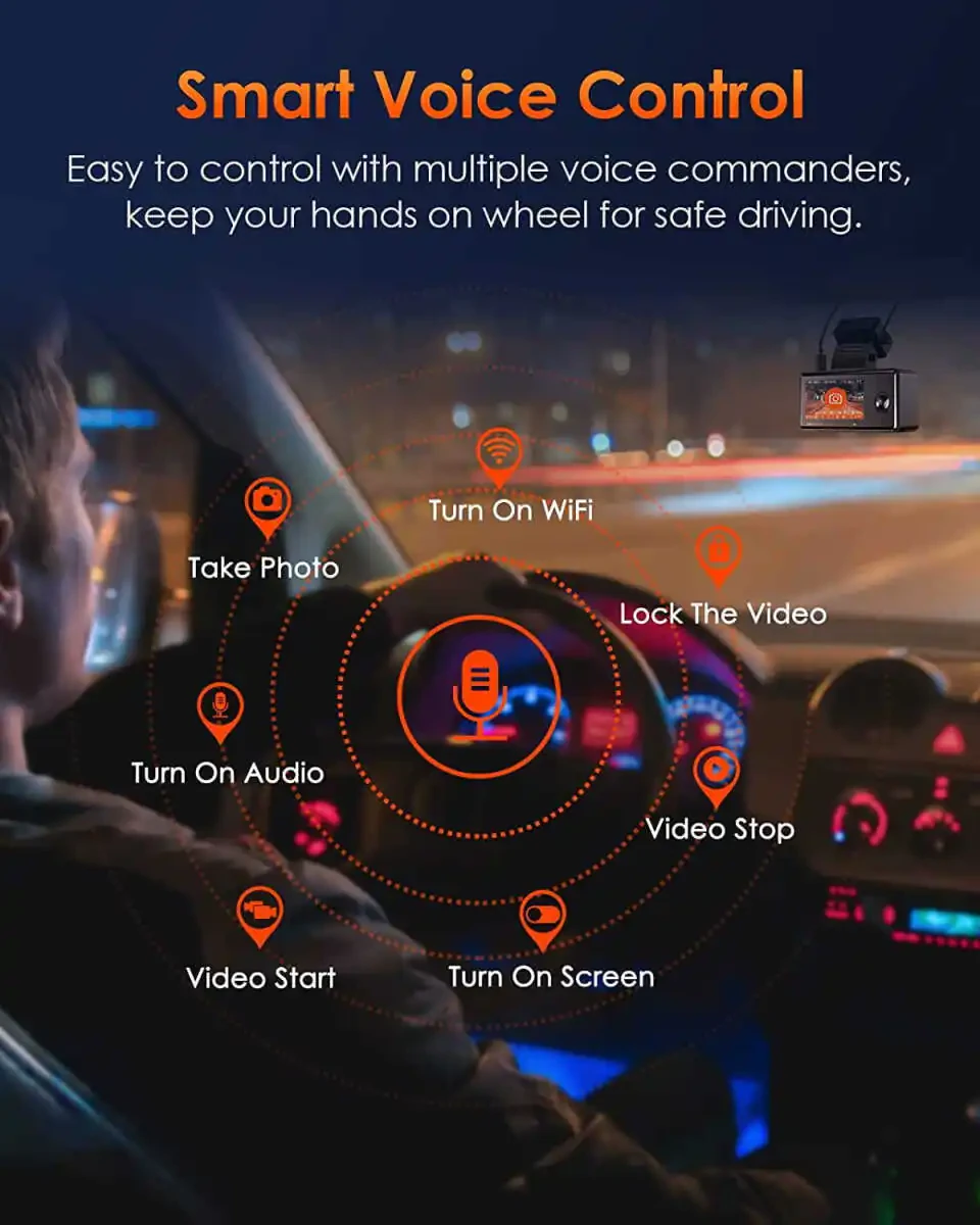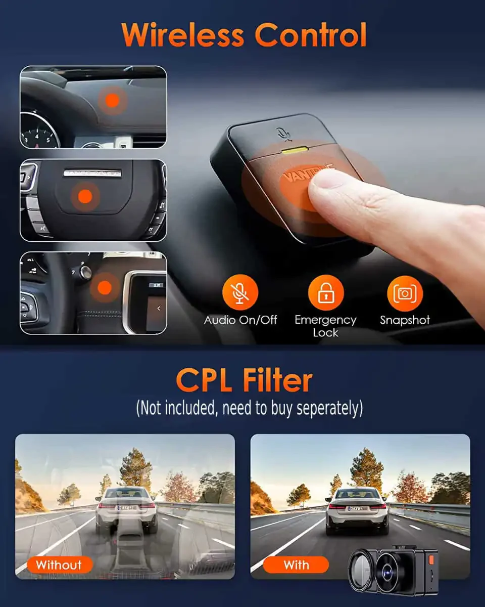 Take your driving safety to the next level with the Vantrue Element 3 (E3) 3-Channel 2.7K WiFi Dash Cam! Featuring three separate cameras – front, interior, and rear – the E3 offers a nearly 360-degree wide viewing angle, providing complete coverage around your vehicle. Capturing exceptionally clear images with 1944P + 1080P + 1080P resolutions, the E3’s front (160°), interior (165°), and rear (160°) cameras capture every detail, giving you peace of mind. Use the voice control feature to keep your hands free while driving. Easily control the E3 with commands like “Take a photo”, “Turn on the screen”, “Turn on WiFi”, and “Mute”. A wireless remote control with a recording lock or photo button and a sound on/off button is also included. With 5 GHz WiFi connectivity, you can use the “VANTRUE” app to preview live footage, play, edit, and share videos on social media. 5 GHz WiFi is 4 times faster than 2.4 GHz WiFi. The Sony Starvis sensor provides exceptional night vision quality even in low-light conditions. You will obtain clear images even in low light during parking mode. For parking mode, you need to purchase a hardwire kit or OBD cable to provide constant power while the vehicle is off. Four different parking modes are available: 15-second buffered motion detection, low bitrate recording, time-lapse recording, and collision detection. The built-in GPS module in the magnetic mount eliminates the need for an additional GPS mount. You can view speed, location, and route information with the Vantrue GPS player. The G-sensor will automatically lock the current recording in case of an accident, preventing the loss of important files. It offers long-term recording with support for up to a 512GB microSD card. With the Vantrue E3, you'll feel safe at all times.