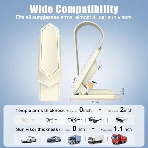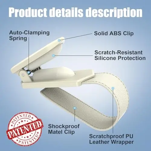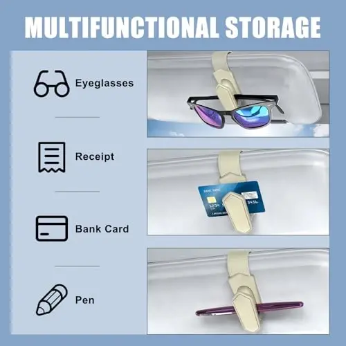 [Patented Design & ONE-HANDED-OPERATION] The Veharvim Sunglass holder for car is designed with an automated clamping structure and soft silicone material with high elasticity. Our car sunglass holder has a strong spring clamping system, keeping your glasses away from falling and becoming disordered. This makes it easy to securely hold glasses and allows for easy one-handed-operation. [Suitable for all Eyeglasses] Based on scientific and humanized design, the Veharvim car sunglass holder can hold different sizes of sunglasses, even thicker ones, non-magnetic cards, tickets, and cash. Let the visor sunglasses holder clip help you keep the interior of the car tidy and orderly. [More Stable and Safe] The Veharvim glasses holder is composed of a Sturdy Hardware Structure and Soft Accessory Structure. The sunglass clip for the car visor is made of metal and fully wrapped with PU leather to protect your car sun visor from being scratched. The car visor sunglasses holder has elastic silicone inside to keep your sunglass from deforming. [Easy to Install and Use] The Veharvim sunglass clip for the car visor is easy to use, simply clip it onto the sun visor to organize your sunglasses well. You can easily pick up or place your eyeglasses using just a single hand, and it will not obstruct your driving vision. [Perfect for Any Driver] The Veharvim car sunglass holder's minimalist look and black color make it a versatile addition to any car interior. Its design is suitable for any driver, offering a stylish and functional solution for keeping sunglasses secure and within easy reach while driving.