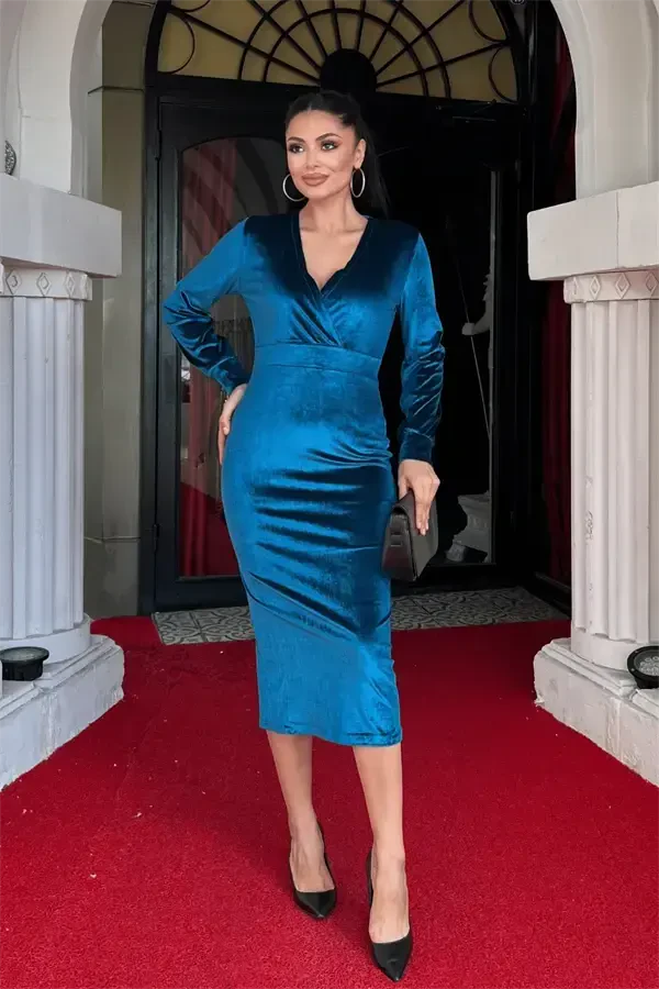 Experience elegance and sophistication with the Velvet Fabric Wrap Neck Pencil Dress. The enchanting shade of turquoise adds a unique touch to this special design dress. From special events to business meetings, from your daily elegance to your special moments, you will dazzle in any setting. The soft texture of the velvet fabric caresses your skin, while the wrap neck detail highlights your femininity. The pencil skirt cut perfectly hugs your body lines, creating a chic silhouette. This dress is a candidate to be an indispensable part of your wardrobe!The length of the dress from shoulder to hem is 105 cm (may vary between 1-3 cm), making it both an elegant and comfortable option. Thanks to the slight elasticity of the velvet fabric, your freedom of movement is not restricted, while the full-fitting cut perfectly hugs your body. The unlined structure preserves the lightness of the dress, while providing comfort even in direct contact with your skin. This dress, which has no zipper detail, can be easily put on and taken off, offering a practical use.The product on the model is size S/36. Model measurements: Height: 1.68 cm, Weight: 52 kg, Bust: 85 cm, Hips: 90 cm. This information will help you choose your size. The Velvet Fabric Wrap Neck Pencil Dress is a design that will not only make you look stylish but also make you feel special. Brighten your day with the energy of turquoise and attract attention in any environment. Order this unique dress now and take your style to the next level! Whether you combine it with heels or complete it with a stylish clutch, the Velvet Fabric Wrap Neck Pencil Dress will always be a perfect choice.
