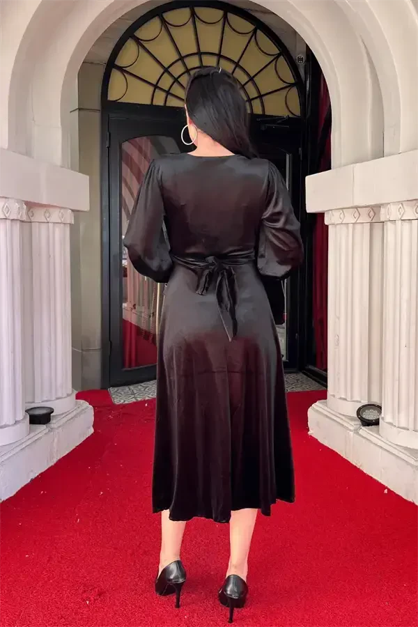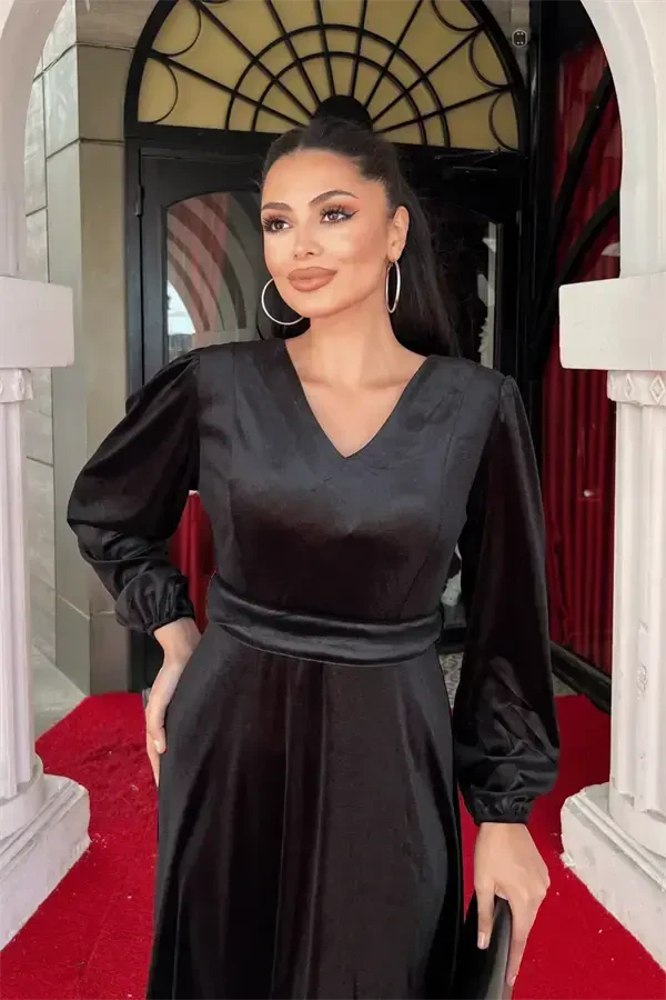 Capture the perfect harmony of elegance and style with the Velvet Fabric V-Neck Midi Dress - BLACK! This eye-catching black dress will make you stand out in any setting, from special occasions to everyday wear. The luxurious texture of the velvet fabric gives you the feeling of wearing a work of art, while the midi length and V-neck cut emphasize your femininity. The dress's fluid silhouette gently accentuates your body lines while allowing you freedom of movement.This special design dress is a candidate to be an indispensable part of your wardrobe. Whether you create a stylish combination with high heels or complete it with flats or sandals for a casual look. The versatile design of the dress adapts easily to different accessories, allowing you to create a different style every time.The Velvet Fabric V-Neck Midi Dress will appeal to you not only with its stylish appearance but also with its comfort. Thanks to its slightly flexible structure, it offers a comfortable use all day long, while its full-fitting cut fits your body perfectly. Although the product does not have a lining, the soft texture of the velvet fabric gently touches your skin.One of the most striking details of the dress is its stylish belt. The belt emphasizes your waist and further enhances your silhouette. Whether you use it with a belt or combine it with a different belt to suit your style, you will be dazzling in every way.The Velvet Fabric V-Neck Midi Dress is produced with high-quality material and careful workmanship. Designed for long-lasting use, this dress will be one of the most valuable pieces of your wardrobe. You will always look stylish and elegant with this dress that combines the nobility of black and the luxury of velvet. Be sure to try the Velvet Fabric V-Neck Midi Dress to feel special and reflect your style! This dress, which contains elegance in every detail, will take you one step further in every environment. Remember, elegance is hidden in the details, and this dress offers you all the details you need.