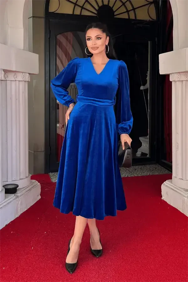 Experience elegance and comfort together with the Velvet Fabric V-Neck Midi Dress. This dress, dazzling with its SAXE BLUE color, will accompany you in every setting, from special invitations to daily use. The soft texture of the velvet fabric gives your skin a pleasant feeling, while the midi-length cut emphasizes your elegance. The V-neck detail allows you to showcase your décolletage elegantly while adding a modern touch to the overall design of the dress.This special design dress perfectly reveals your body lines. Thanks to its full fit, it fits you perfectly and does not restrict your freedom of movement. Thanks to its slightly flexible structure, it offers comfortable use throughout the day. The belt detail that complements the simplicity of the dress helps you achieve a fitter look by emphasizing your waist.The Velvet Fabric V-Neck Midi Dress is a candidate to be one of the indispensable pieces of your wardrobe. You can attend a special invitation by combining it with stylish high heels and elegant jewelry, or you can create a more comfortable style with sneakers for daily use. This dress, which will make your style speak in every situation, will make you different in every environment.The use of the dress is also very practical. You can easily put it on and take it off thanks to the absence of a zipper. Although it does not have a lining, it does not show through and offers comfortable use thanks to the structure of the velvet fabric. The vibrancy of the SAXE BLUE color and the luxurious look of the velvet fabric come together to give you a unique style experience.Always feel stylish and confident with the Velvet Fabric V-Neck Midi Dress. This special design dress is not just a piece of clothing, but also a form of expression that reflects your style and personality. You should definitely try this dress to feel special and attract attention. Create unforgettable memories with the enchanting tone of SAXE BLUE and the touch of velvet fabric. Get ready to be the most valuable piece of your wardrobe!