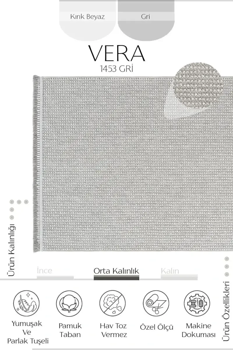 Vera 1453 Gray Soft Touch Carpet Rug is designed to add elegance and comfort to every corner of your home. This machine-made carpet, offered with Cool Halı assurance, stands out with its modern weaving techniques and quality material usage. This carpet, which adapts to any area from your living room to your kitchen, from your hallway to your bedroom, will add a warm atmosphere to your living spaces with its gray color and soft texture. The special texture of the carpet gives your feet a soft touch feeling, while its durability ensures that it maintains its appearance as on the first day for many years. Vera 1453 is not just a carpet, but a decoration element that complements the style of your home. Being suitable for robot vacuum cleaner use makes your cleaning tasks easier, and its lint-free structure makes it an ideal option for allergy sufferers. With special size options, this carpet, which you can have in any size you want, fits perfectly into every corner of your home. Thanks to its cotton base, it does not slip on the floor and offers safe use. Its medium thickness offers both a comfortable walking experience and allows doors to open and close easily. Experience both elegance and comfort together in your home with Vera 1453 Gray Soft Touch Carpet Rug.