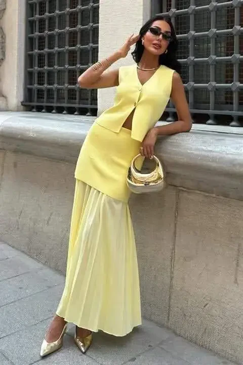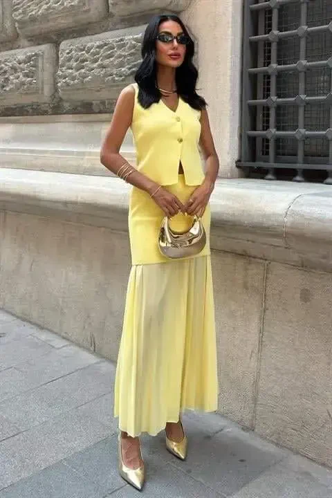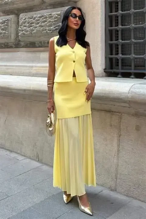 Experience elegance and comfort together with the Knitted Suit with Vest and Pleated Skirt 10001. This special design knitted suit is a must-have piece in the modern woman's wardrobe. Ideal for both daily use and special occasions, this suit combines elegance and comfort. Thanks to its high-quality knit material, it offers comfort all day long, while the pleated skirt detail provides a lively and stylish look. The vest detail adds a different dimension to the suit, allowing you to add variety to your combinations.One of the most striking features of the suit is that it creates a perfect silhouette thanks to its body-hugging cut. The flexibility of the knit fabric ensures that it fits you perfectly without restricting your freedom of movement. The pleated skirt adds an elegant touch to your steps, while the vest both completes the elegance and offers the possibility to make different combinations. You can use this suit alone or combine it with different tops, allowing you to express your style in any environment.Knitted Suit with Vest and Pleated Skirt 10001 offers suitable alternatives for every body type with different size options. The M/38 size on the model exhibits an ideal cut and stance. The color options of the suit have been carefully selected to appeal to all tastes. This suit, which includes classic colors as well as the season's trend colors, will add a modern touch to your style.This knitted suit not only looks stylish but also offers ease of use. High-quality knit material is easy to wash and iron. In this way, it ensures that you always look well-groomed and stylish. This suit, which will be an indispensable part of your wardrobe, also draws attention with its long-lasting use.Take your style to the next level with the Knitted Suit with Vest and Pleated Skirt 10001. This special design suit, which offers both comfort and elegance, is a piece that will adorn the dreams of every woman. With its eye-catching details and perfect cut, you will attract attention in any environment. You should definitely try this suit to feel special and reflect your style. Remember, elegance is hidden in the details, and this suit will fascinate you with every detail.