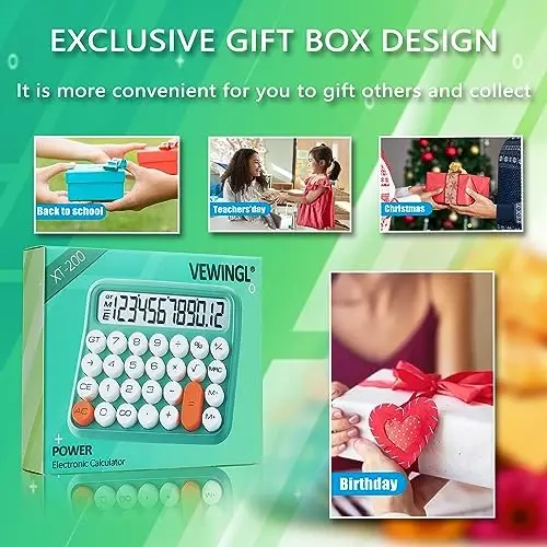 🔢 Imitation Mechanical Keyboard: Large, easy-to-press buttons provide fast, accurate input with a satisfying click. The 12-digit LCD screen and 15° tilt ensure easy readability for everyday use. 💡 Charming Retro Design: Inspired by typewriters, with retro round keys and an ergonomic, spring-loaded design to reduce hand fatigue. Perfect for both desktop and handheld use. 🌟 Versatile and Stylish: Ideal for home, school, office, or shop use. The gift box design makes it a great present. 🛠️ Durable and Lightweight: Made with high-quality ABS plastic, featuring an anti-slip design for secure use. Includes memory functions and essential math operations like square root (√) and percentage (%). 🔋 Energy Efficient: Runs on a single AAA battery (included), with an auto power-off feature after 10 minutes of inactivity to save battery life.