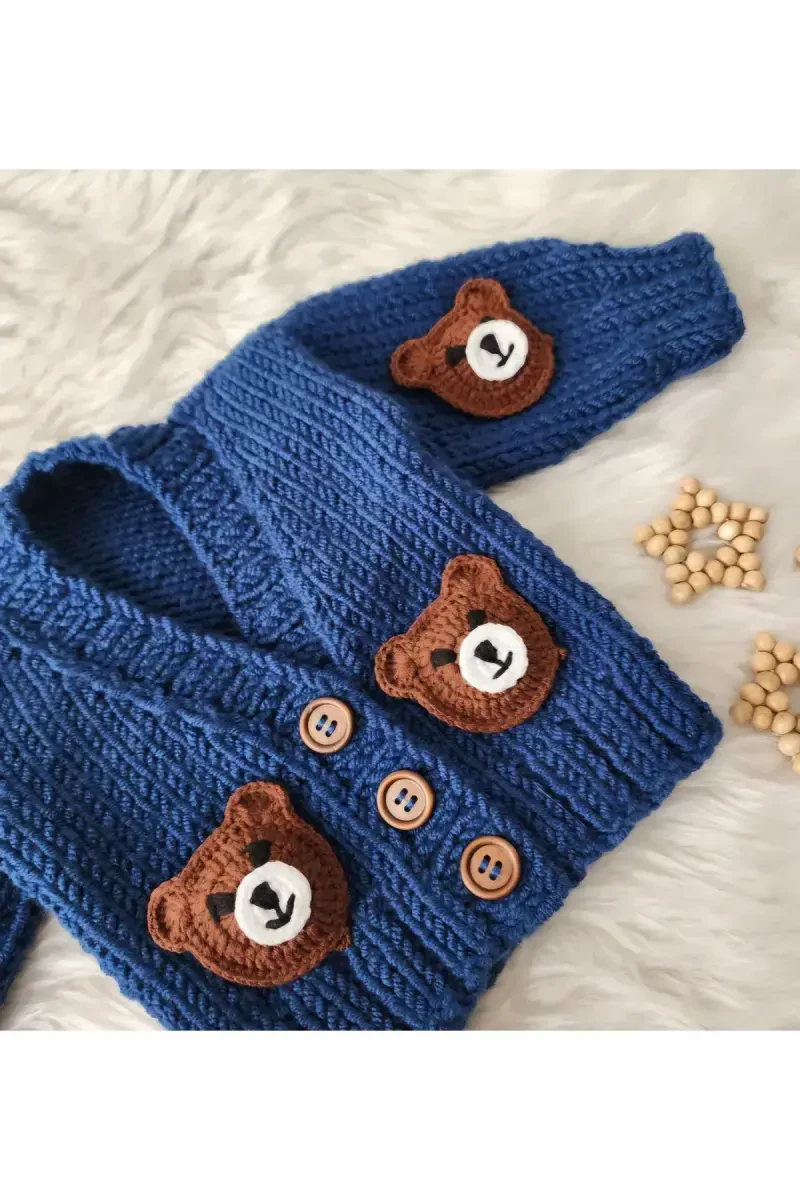 Вязаный вручную кардиган для мальчиков и девочек с мишками от ZA HANDMADE - это особый предмет гардероба, который добавит стиля и тепла маленьким. Этот кардиган в успокаивающем синем цвете и с милым узором с мишками понравится младенцам и детям. Этот кардиган средней толщины обеспечивает идеальную температуру в переходные периоды и в прохладную погоду, предотвращая переохлаждение малышей. Благодаря окрашенной пряже цвет остается ярким в течение длительного времени и не выцветает, поэтому кардиган остается как новый. Стандартная длина позволяет младенцам и детям свободно двигаться, позволяя им чувствовать себя свободными, играя или проводя время на улице. Трикотажный тип ткани придает кардигану классический и вневременной вид, а V-образный вырез облегчает одевание и придает стильный вид. Длинные рукава согревают руки, обеспечивая свободу движений. Этот кардиган, специально разработанный для младенцев и детей, ставит во главу угла их комфорт и безопасность. Длинный рукав, обеспечивающий дополнительную защиту в холодную погоду, также создает стильный силуэт. Этот кардиган из коллекции Design предлагает современный и стильный вид. Застежка на пуговицах обеспечивает практичность и выделяется как эстетичная деталь. Акриловый материал не раздражает кожу своей мягкой текстурой и обеспечивает комфорт при ношении в течение всего дня. Тот факт, что он связан вручную, означает, что в каждой петле есть любовь и забота. Этот кардиган — не просто предмет одежды, но и памятная вещь. Этот кардиган, который можно смело выбирать для особых дней или для повседневного использования, станет практичным и стильным вариантом. Этот кардиган, произведенный с качеством ZA HANDMADE, обеспечивает долговечность и становится незаменимой частью гардероба малышей.