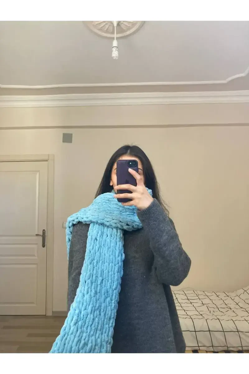Вязаный вручную бирюзовый шарф-шаль | Пряжа Puffy, теплый стильный дизайн