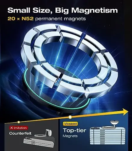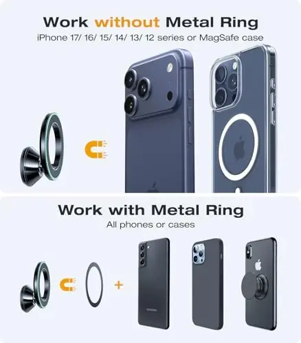 [Strongest Adhesion, Certified Through Time] - As the leader of adhesive MagSafe car mounts, all customer voices are enough to prove the reliability of VICSEED! Unlike other inferior counterfeits that require one hand pressing the base to pick up your phone, you can use Halo mount worry-free without fearing it will fall off, whether in the freezing Arctic or the tropical rainforest(-40°F~194°F )! 5 years for adhesive development expertise, top-grade 3M adhesive, Halo definitely fit your car [Unrivaled Magnetism, True Zero Drops] - This magnetic phone holder for car features top-tier N52 permanent magnets — just 2 magnets can secure 1 phone. Equipped with 20 magnets, our phone mount for car has far more magnetic power than any car holder on the market, not weaken with temp or time. Even during bumpy rides resembling a roller coaster, your phone will never fall off and distract you. Annular closed magnetic field, not interfere with the signal or battery drain. Vicseed means safe [Work for MagSafe & Any Phone with Any Case] - This phone holder car not only 1: 1 precisely fits the MagSafe feature of iPhones, directly adhering to iPhone 17/16/15/14/ 13/ 12 series, but also magnetically attaches to all phones and cases with our included metal ring, such as Android phones and thick cases. The hollow design of the metal ring will not affect the wireless charging like other metal plates. Give you the ultimate simple experience that you can use right out of the box [Small and 360° Flexible] - As the lightest magnetic car cell phone holder on the market, you can install it anywhere. It doesn't take up space in your car or obstruct the view, easy adaptation into any car, make your car’s interior space wider. The iphone car mount has a 360-degree omnidirectional adjustment ball joint, you can twist the magnetic ring panel to set the orientation of your phone arbitrarily, ensuring that your phone is always at the angle you like [Top Quality, No Detail Missed] - A car mount breaks after just 3 months of use is extremely dangerous! Only VICSEED car phone holder mount is entirely crafted from aerospace-grade metal, from the frame to the filling and connectors. Ensuring 10 years of reliable use without deformation. Unlike plastic mounts with only an outer metal coating (even the faceplates of magnetic rings will come loose), we hold exclusive design patents. One car holder is enough to give you complete peace of mind [Give You Most Intimate Accompaniment] - The whole body of this car magnetic phone mount is made of high-grade aluminum alloy, super durable and won't break easily like other plastic mounts. Exclusively designed fluorescence silicone on magnetic ring panel, so you can find the safety seat of your phone at a glance in the dark night. Vicseed provides 12 months warranty service, you can contact us at any time, we will spare no effort to solve your problem NOTE:Stick to a flat surface (horizontal or vertical), then press for 1 minute. For best results, wait 24 hours before using Doesn't fit for Suede & Genuine Leather & Coated Surface, and the product must be installed on a flat and smooth surface. Note: the 3M adhesive is single-use. The included spare 3M adhesive should be used if repositioning is needed