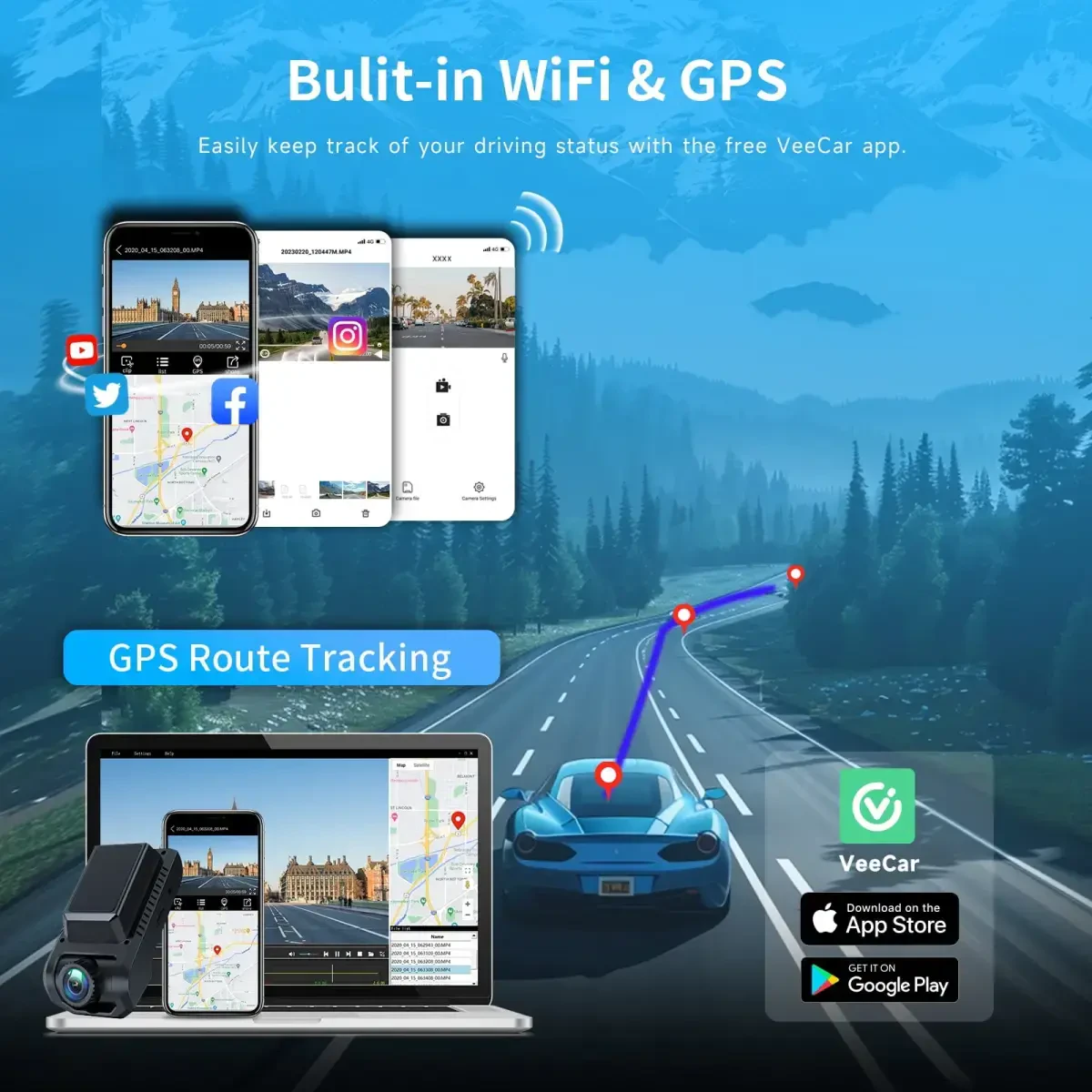 - Встроенный GPS и Wi-Fi: Легко подключается к вашему смартфону через приложение Veecar, позволяя просматривать данные GPS (маршрут, скорость, местоположение и т.д.), загружать и делиться видеозаписями.